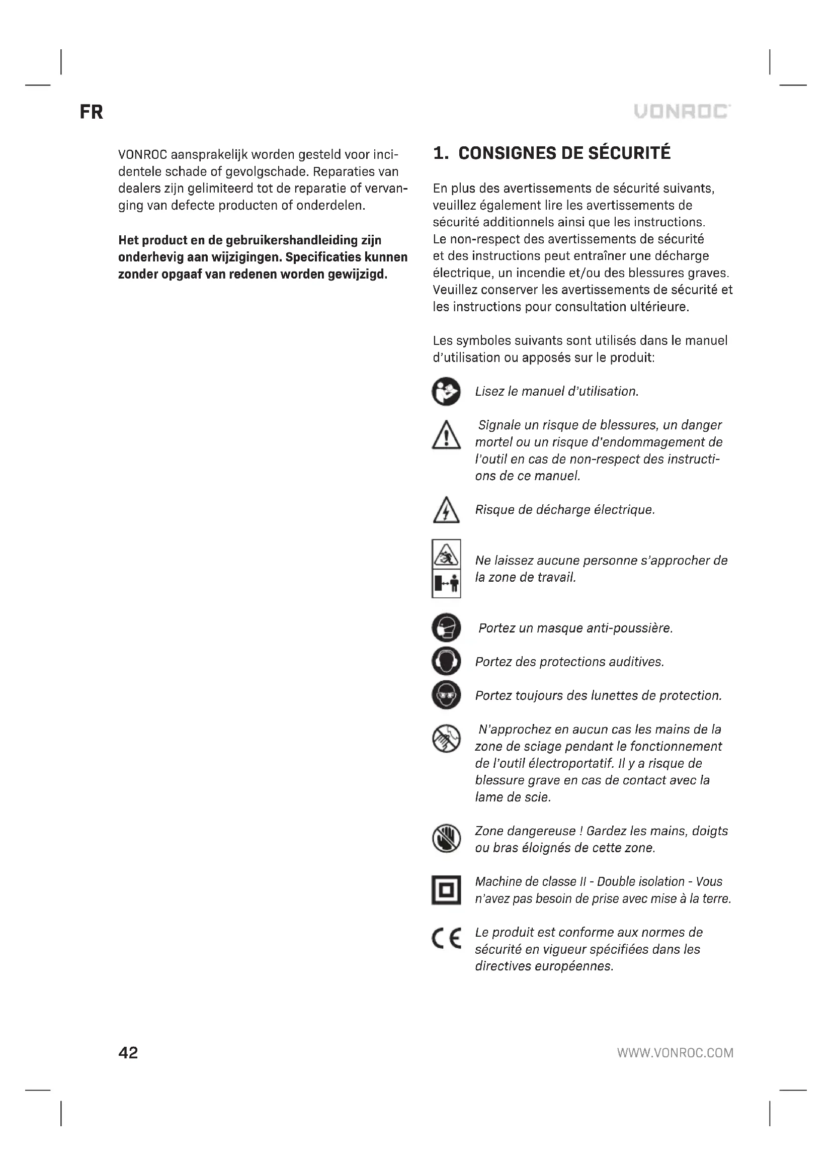 En plus des avertissements de sécurité suivants, veuillez également lire les avertissements de sécurité additionnels ainsi que les instructions. Le non-respect des avertissements de sécurité et des instructions peut entraîner une décharge électrique, un incendie et/ou des blessures graves. Veuillez conserver les avertissements de sécurité et les instructions pour consultation ultérieure. Les symboles suivants sont utilisés dans le manuel d’utilisation ou apposés sur le produit: Lisez le manuel d’utilisation. Signale un risque de blessures, un danger mortel ou un risque d’endommagement de l’outil en cas de non-respect des instructi- ons de ce manuel. Risque de décharge électrique. Ne laissez aucune personne s’approcher de la zone de travail. Portez un masque anti-poussière. Portez des protections auditives. Portez toujours des lunettes de protection. N’approchez en aucun cas les mains de la zone de sciage pendant le fonctionnement de l’outil électroportatif. Il y a risque de blessure grave en cas de contact avec la lame de scie. Zone dangereuse ! Gardez les mains, doigts ou bras éloignés de cette zone. Machine de classe II - Double isolation - Vous n’avez pas besoin de prise avec mise à la terre. Le produit est conforme aux normes de sécurité en vigueur spécifiées dans les directives européennes.FR