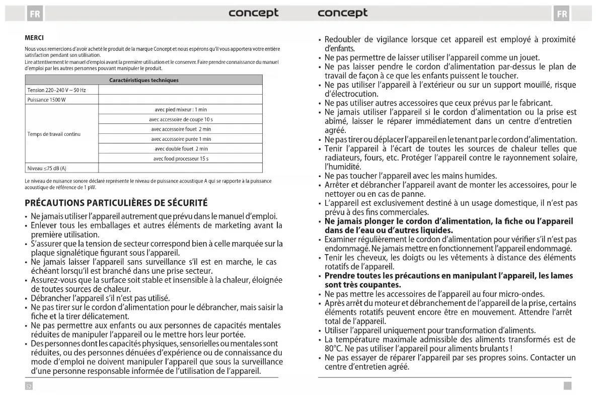 - Les sachets en plastique (PE) sont à remettre dans le centre de collecte sélective pour recyclage. Recyclage de l’appareil à la fin de sa durée de vie : La désignation du produit est conforme à la Directive européenne 2012/19/CE relative aux déchets d'équipements électriques et électroniques (WEEE). Le symbole apposé sur le produit ou son emballage indique que le produit ne doit pas être éliminé avec les déchets municipaux. Il est nécessaire de le remettre dans un centre de collecte pour le recyclage des équipements électriques et électroniques. En assurant une élimination conforme de ce produit, vous pouvez empêcher tout impact négatif sur l’environnement et sur la santé humaine résultant de la liquidation non conforme de ce produit. Éliminer le produit en conformité à la réglementation de traitement de déchets. De plus amples informations concernant le recyclage peuvent être obtenues auprès de l’administration locale compétente, les centres de tri de déchets ménagers ou dans le magasin où vous avez acheté votre produit. Ce produit satisfait aux exigences élémentaires des directives CE applicables. Le fabricant se réserve le droit d’effectuer les modifications du texte, design et spécifications techniques sans informations au préalable. RINGRAZIAMENTO Grazie per aver acquisito il prodotto di marchio Concept e vi auguriamo che vi dia la massima soddisfazione per tutta la durata della sua vita utile. Si consiglia di leggere attentamente l’intero manuale d’uso prima di procedere al primo uso dell’apparecchio stesso. Conservare bene il manuale d’uso. Provvedere che tutte le persone addette all’uso del prodotto facciano la conoscenza del manuale d’uso. Parametri tecnici Tensione 220–240 V ~ 50 Hz Potenza assorbita 1500 W Tempo di funzionamento ininterrotto con l’asta da immersione: 1 min con accessorio per tritare 10 s con accessorio per montare 2 min con accessorio per lavorare le verdure cotte 1 min con doppia frusta 2 min con food processor 15 s Rumorosità ≤75 dB (A) I valori dichiarati di rumorosità rappresentato il livello A della potenza acustica riferita alla potenza acustica 1 pW.