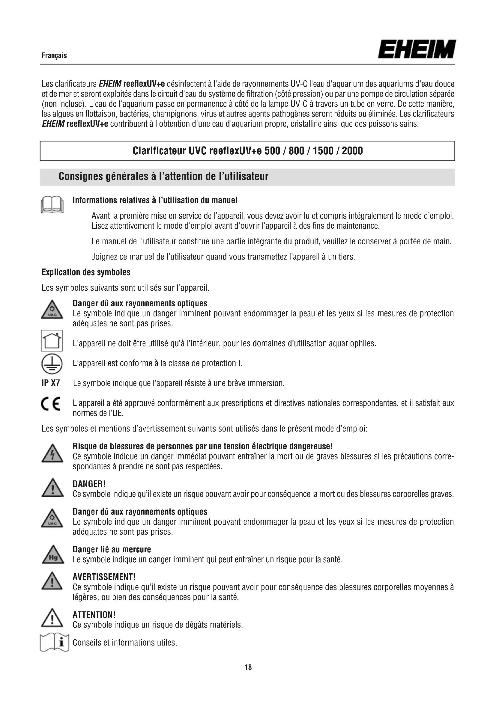 Disposal When disposing of the appliance, heed the respective statutory regulations. Information on the disposal of elec- trical and electronic appliances in the European Union: Within the European Union, disposal of electrically ope- rated appliances is governed by national regulations that are based on the EU Directive 2012/19/EU on waste electrical and electronic equipment (WEEE). The appliance may no longer be disposed of with the municipal or household waste. The appliance will be accepted free of charge at municipal collection points or recycling centres. The product packaging is made up of recyclable materials. Dispose of them in an environmentally responsible manner and take them for recycling. Decommissioning and disposal18 Consignes générales à l’attention de l’utilisateur Informations relatives à l’utilisation du manuel Avant la première mise en service de l’appareil, vous devez avoir lu et compris intégralement le mode d’emploi. Lisez attentivement le mode d'emploi avant d'ouvrir l'appareil à des fins de maintenance. Le manuel de l’utilisateur constitue une partie intégrante du produit, veuillez le conserver à portée de main. Joignez ce manuel de l’utilisateur quand vous transmettez l’appareil à un tiers. Explication des symboles Les symboles suivants sont utilisés sur l’appareil. Danger dû aux rayonnements optiques Le symbole indique un danger imminent pouvant endommager la peau et les yeux si les mesures de protection adéquates ne sont pas prises. L’appareil ne doit être utilisé qu’à l’intérieur, pour les domaines d’utilisation aquariophiles. L’appareil est conforme à la classe de protection I. IP X7 Le symbole indique que l'appareil résiste à une brève immersion. L'appareil a été approuvé conformément aux prescriptions et directives nationales correspondantes, et il satisfait aux normes de l'UE. Les symboles et mentions d’avertissement suivants sont utilisés dans le présent mode d’emploi: Risque de blessures de personnes par une tension électrique dangereuse! Ce symbole indique un danger immédiat pouvant entraîner la mort ou de graves blessures si les précautions corre- spondantes à prendre ne sont pas respectées. DANGER! Ce symbole indique qu’il existe un risque pouvant avoir pour conséquence la mort ou des blessures corporelles graves. Danger dû aux rayonnements optiques Le symbole indique un danger imminent pouvant endommager la peau et les yeux si les mesures de protection adéquates ne sont pas prises. Danger lié au mercure Le symbole indique un danger imminent qui peut entraîner un risque pour la santé. AVERTISSEMENT! Ce symbole indique qu’il existe un risque pouvant avoir pour conséquence des blessures corporelles moyennes à légères, ou bien des conséquences pour la santé. ATTENTION! Ce symbole indique un risque de dégâts matériels. Conseils et informations utiles. Clarificateur UVC reeflexUV+e 500 / 800 / 1500 / 2000 Français Les clarificateurs EHEIM reeflexUV+e désinfectent à l'aide de rayonnements UV-C l'eau d'aquarium des aquariums d'eau douce et de mer et seront exploités dans le circuit d'eau du système de filtration (côté pression) ou par une pompe de circulation séparée (non incluse). L'eau de l'aquarium passe en permanence à côté de la lampe UV-C à travers un tube en verre. De cette manière, les algues en flottaison, bactéries, champignons, virus et autres agents pathogènes seront réduits ou éliminés. Les clarificateurs EHEIM reeflexUV+e contribuent à l'obtention d'une eau d'aquarium propre, cristalline ainsi que des poissons sains.Domaine d’application L’appareil et toutes les pièces fournies sont destinés à être utilisés dans le domaine privé et ils ont été conçus exclusivement: