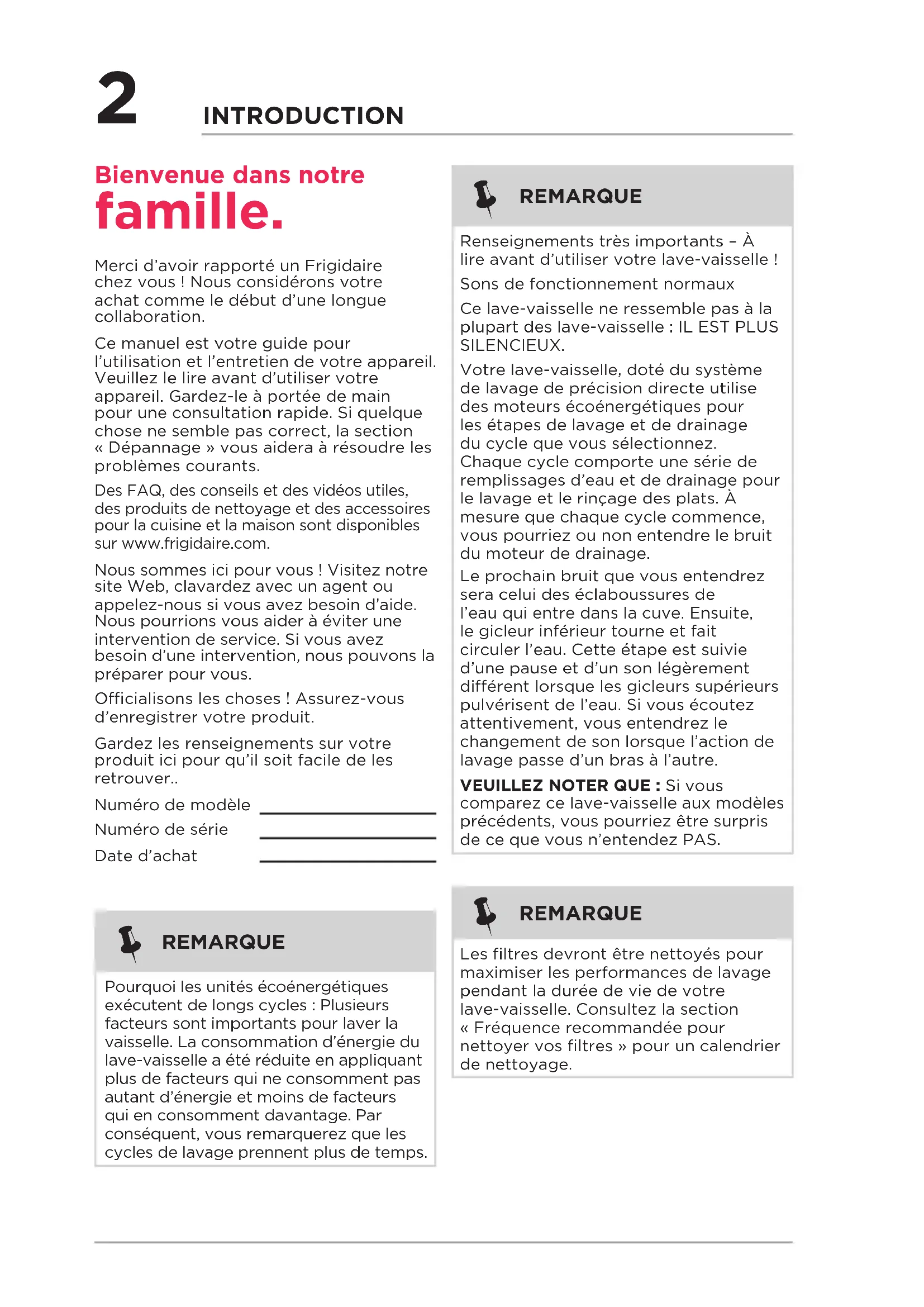 REMARQUE Renseignements très importants–À lire avant d’utiliser votre lave-vaisselle!Sons de fonctionnement normauxCe lave-vaisselle ne ressemble pas à la plupart des lave-vaisselle:IL EST PLUS SILENCIEUX.Votre lave-vaisselle, doté du système de lavage de précision directe utilise des moteurs écoénergétiques pour les étapes de lavage et de drainage du cycle que vous sélectionnez. Chaque cycle comporte une série de remplissages d’eau et de drainage pour le lavage et le rinçage des plats. À mesure que chaque cycle commence, vous pourriez ou non entendre le bruit du moteur de drainage. Le prochain bruit que vous entendrez sera celui des éclaboussures de l’eau qui entre dans la cuve. Ensuite, le gicleur inférieur tourne et fait circuler l’eau. Cette étape est suivie d’une pause et d’un son légèrement diérent lorsque les gicleurs supérieurs pulvérisent de l’eau. Si vous écoutez attentivement, vous entendrez le changement de son lorsque l’action de lavage passe d’un bras à l’autre.VEUILLEZ NOTER QUE: Si vous comparez ce lave-vaisselle aux modèles précédents, vous pourriez être surpris de ce que vous n’entendez PAS. Bienvenue dans notre famille. Merci d’avoir rapporté un Frigidaire chez vous! Nous considérons votre achat comme le début d’une longue collaboration.Ce manuel est votre guide pour l’utilisation et l’entretien de votre appareil. Veuillez le lire avant d’utiliser votre appareil. Gardez-le à portée de main pour une consultation rapide. Si quelque chose ne semble pas correct, la section «Dépannage» vous aidera à résoudre les problèmes courants.Des FAQ, des conseils et des vidéos utiles, des produits de nettoyage et des accessoires pour la cuisine et la maison sont disponibles sur www.frigidaire.com.Nous sommes ici pour vous! Visitez notre site Web, clavardez avec un agent ou appelez-nous si vous avez besoin d’aide. Nous pourrions vous aider à éviter une intervention de service. Si vous avez besoin d’une intervention, nous pouvons la préparer pour vous.Ocialisons les choses! Assurez-vous d’enregistrer votre produit. Gardez les renseignements sur votre produit ici pour qu’il soit facile de les retrouver..Numéro de modèleNuméro de sérieDate d’achat