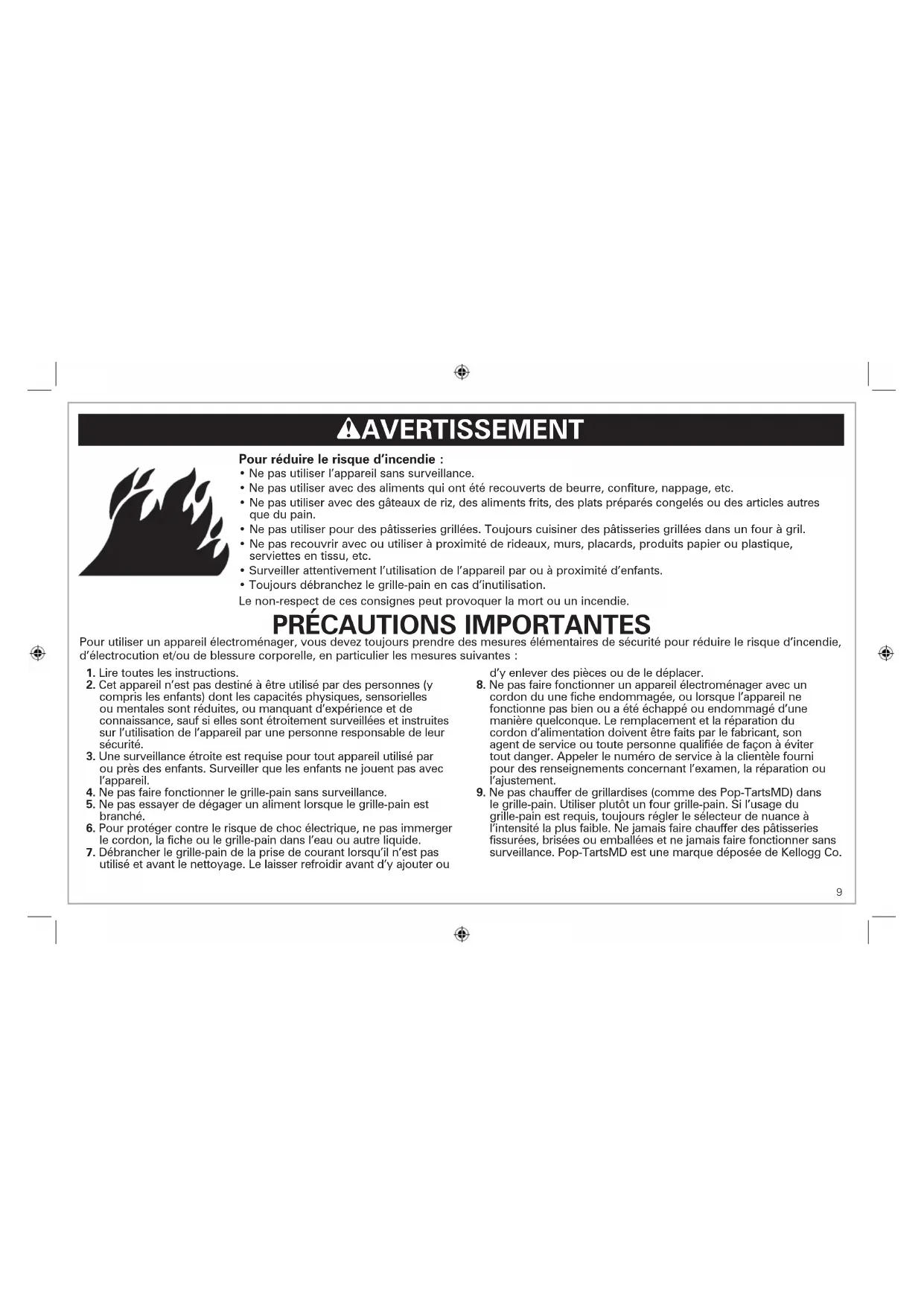 le grille-pain. Utiliser plutôt un four grille-pain. Si l’usage du grille-pain est requis, toujours régler le sélecteur de nuance à l’intensité la plus faible. Ne jamais faire chauffer des pâtisseries fissurées, brisées ou emballées et ne jamais faire fonctionner sans surveillance. Pop-TartsMD est une marque déposée de Kellogg Co.10