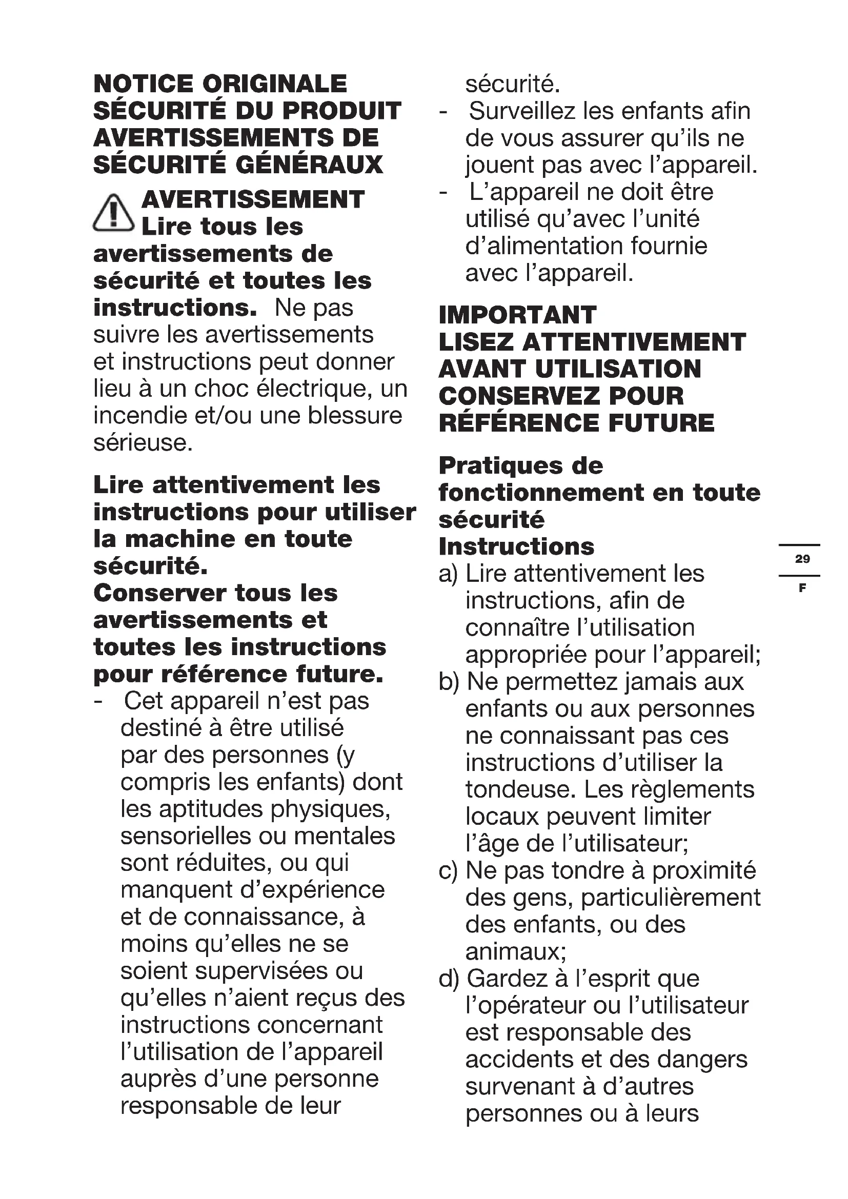 Pratiques de fonctionnement en toute sécurité Instructions a) Lire attentivement les instructions, an de connaître l’utilisation appropriée pour l’appareil; b) Ne permettez jamais aux enfants ou aux personnes ne connaissant pas ces instructions d’utiliser la tondeuse. Les règlements locaux peuvent limiter l’âge de l’utilisateur; c) Ne pas tondre à proximité des gens, particulièrement des enfants, ou des animaux; d) Gardez à l’esprit que l’opérateur ou l’utilisateur est responsable des accidents et des dangers survenant à d’autres personnes ou à leurs30