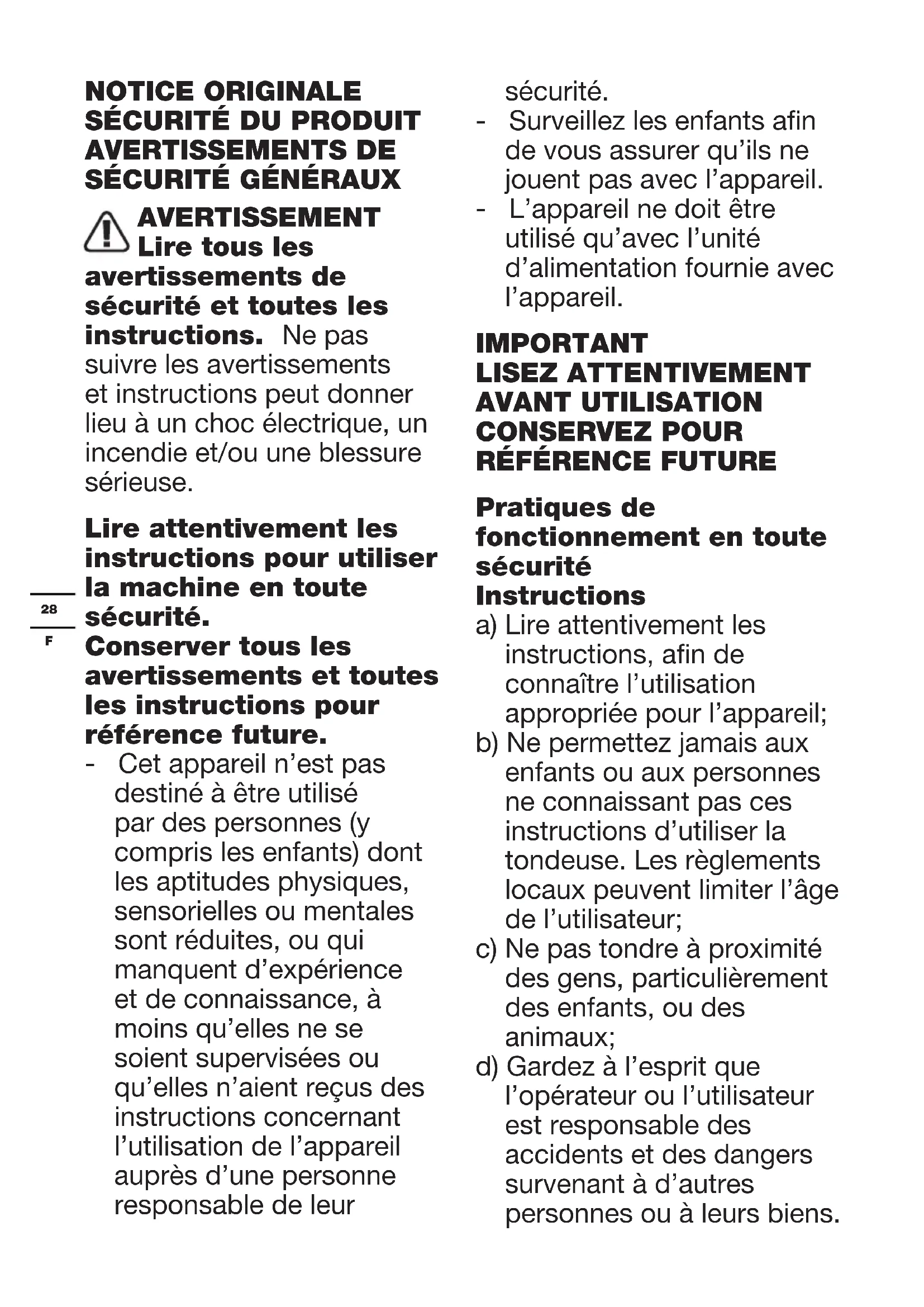 Pratiques de fonctionnement en toute sécurité Instructions a) Lire attentivement les instructions, an de connaître l’utilisation appropriée pour l’appareil; b) Ne permettez jamais aux enfants ou aux personnes ne connaissant pas ces instructions d’utiliser la tondeuse. Les règlements locaux peuvent limiter l’âge de l’utilisateur; c) Ne pas tondre à proximité des gens, particulièrement des enfants, ou des animaux; d) Gardez à l’esprit que l’opérateur ou l’utilisateur est responsable des accidents et des dangers survenant à d’autres personnes ou à leurs biens.29