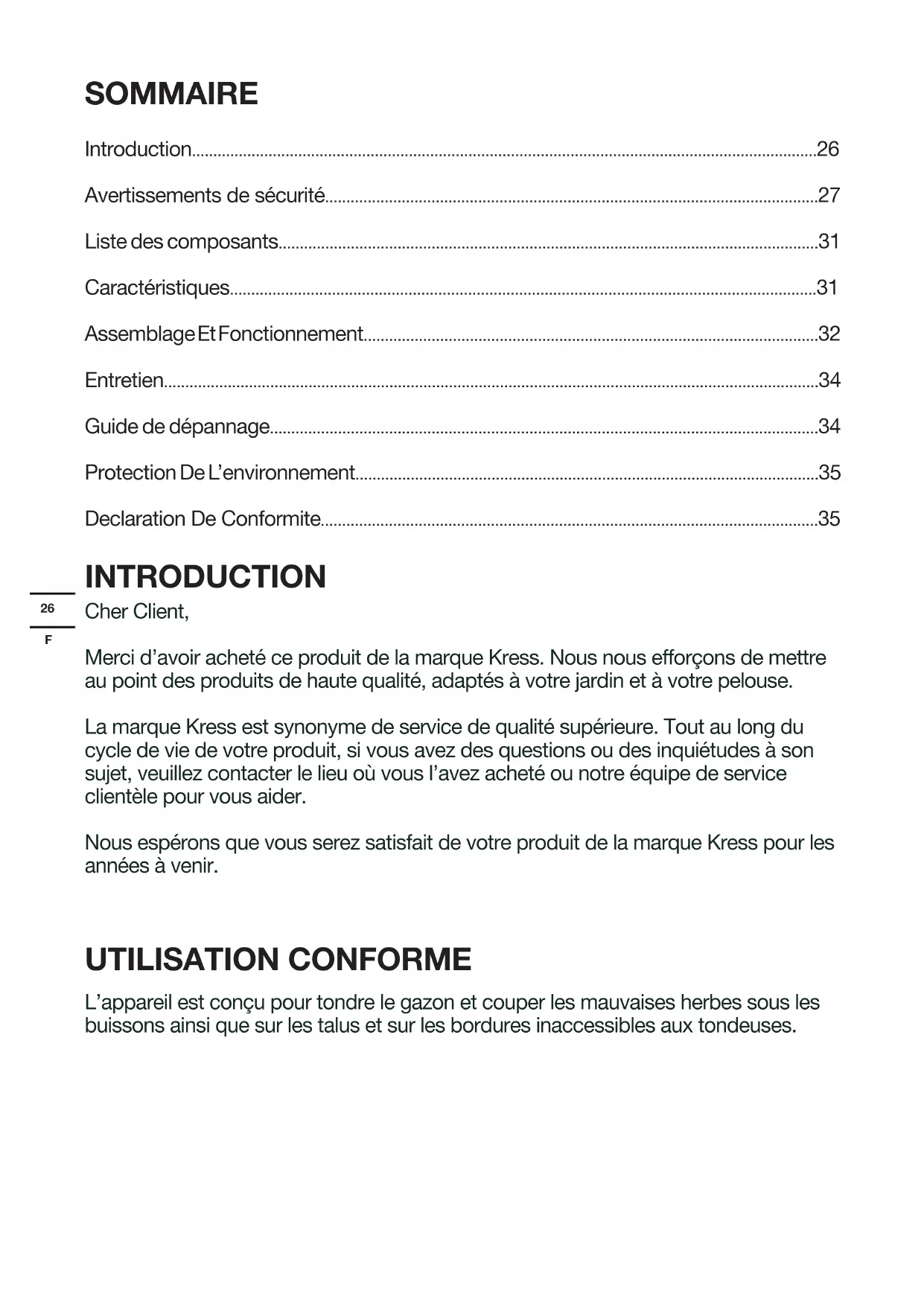 - Declaration De Conformite INTRODUCTION Cher Client, Merci d’avoir acheté ce produit de la marque Kress. Nous nous efforçons de mettre au point des produits de haute qualité, adaptés à votre jardin et à votre pelouse. La marque Kress est synonyme de service de qualité supérieure. Tout au long du cycle de vie de votre produit, si vous avez des questions ou des inquiétudes à son sujet, veuillez contacter le lieu où vous l’avez acheté ou notre équipe de service clientèle pour vous aider. Nous espérons que vous serez satisfait de votre produit de la marque Kress pour les années à venir. UTILISATION CONFORME L’appareil est conçu pour tondre le gazon et couper les mauvaises herbes sous les buissons ainsi que sur les talus et sur les bordures inaccessibles aux tondeuses.27 p. 35