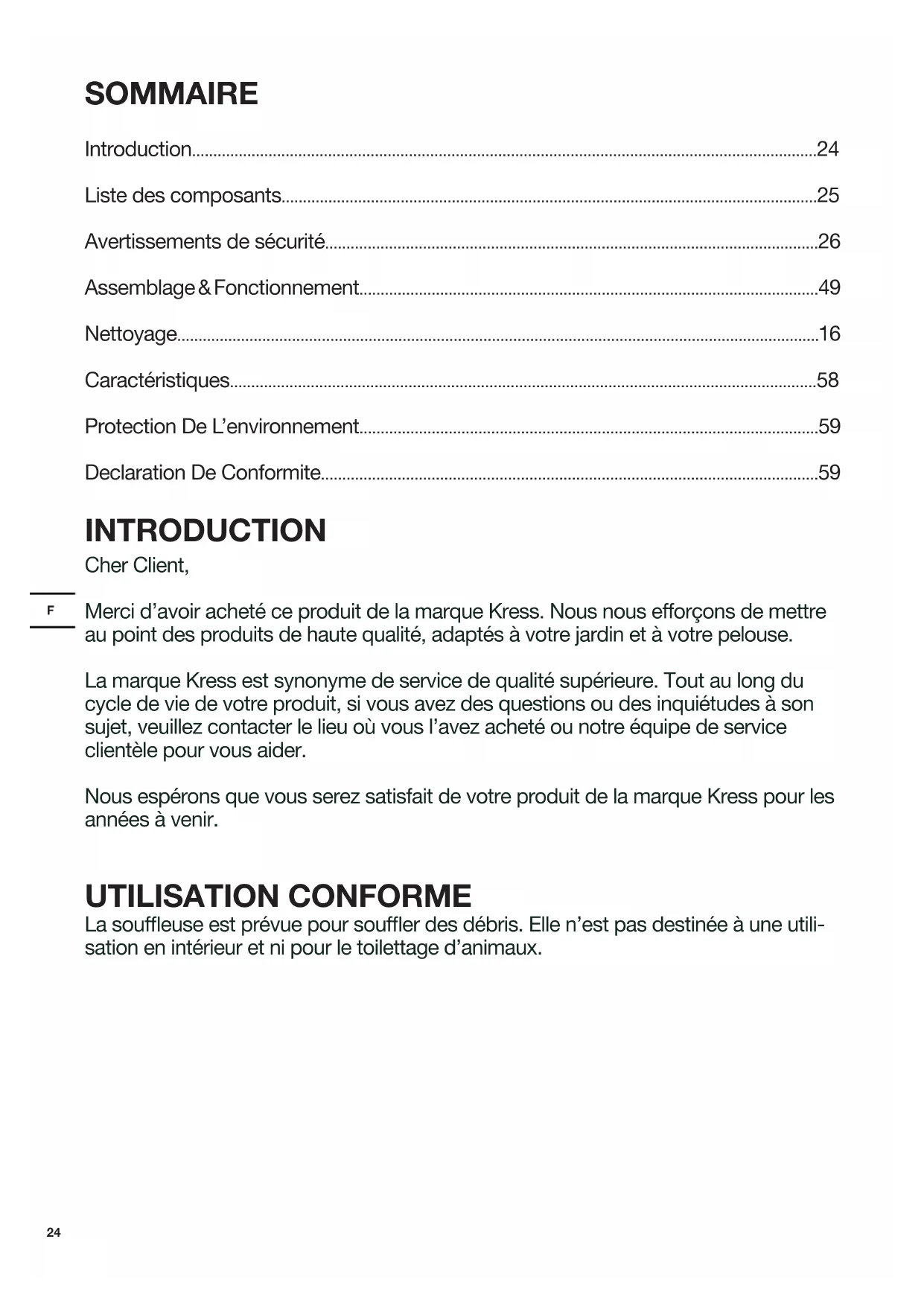 - Declaration De Conformite INTRODUCTION Cher Client, Merci d’avoir acheté ce produit de la marque Kress. Nous nous efforçons de mettre au point des produits de haute qualité, adaptés à votre jardin et à votre pelouse. La marque Kress est synonyme de service de qualité supérieure. Tout au long du cycle de vie de votre produit, si vous avez des questions ou des inquiétudes à son sujet, veuillez contacter le lieu où vous l’avez acheté ou notre équipe de service clientèle pour vous aider. Nous espérons que vous serez satisfait de votre produit de la marque Kress pour les années à venir. UTILISATION CONFORME La soufeuse est prévue pour soufer des débris. Elle n’est pas destinée à une utili- sation en intérieur et ni pour le toilettage d’animaux.25 p. 59