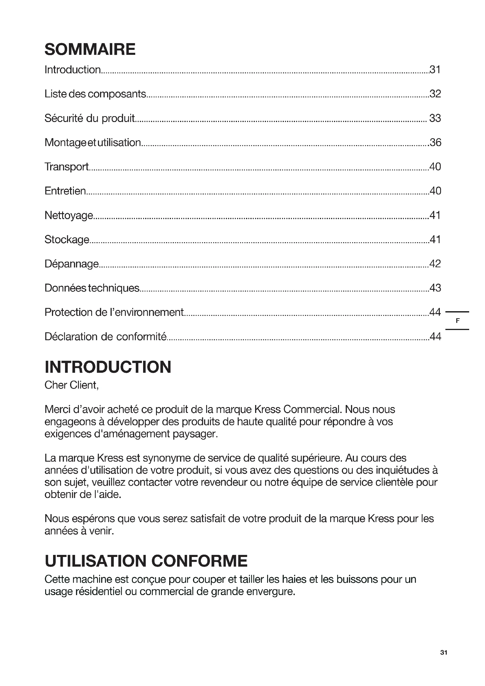 - Déclaration de conformité INTRODUCTION Cher Client, Merci d’avoir acheté ce produit de la marque Kress Commercial. Nous nous engageons à développer des produits de haute qualité pour répondre à vos exigences d'aménagement paysager. La marque Kress est synonyme de service de qualité supérieure. Au cours des années d'utilisation de votre produit, si vous avez des questions ou des inquiétudes à son sujet, veuillez contacter votre revendeur ou notre équipe de service clientèle pour obtenir de l'aide. Nous espérons que vous serez satisfait de votre produit de la marque Kress pour les années à venir. UTILISATION CONFORME Cette machine est conçue pour couper et tailler les haies et les buissons pour un usage résidentiel ou commercial de grande envergure.32 p. 44