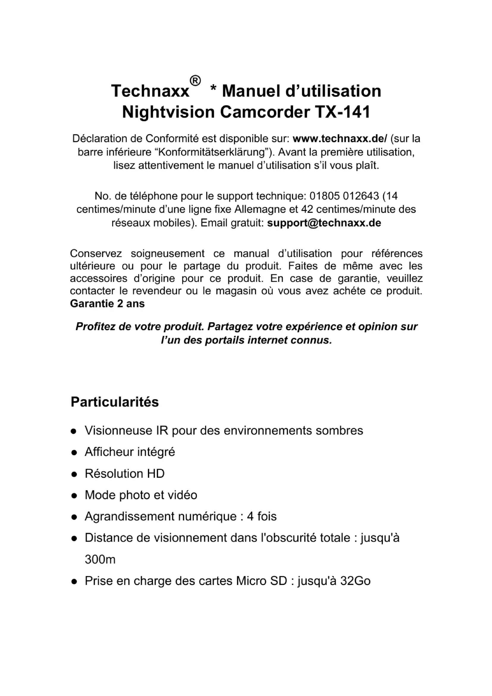 - Manuel d’utilisation Nightvision Camcorder TX-141 Déclaration de Conformité est disponible sur: www.technaxx.de/ (sur la barre inférieure “Konformitätserklärung”). Avant la première utilisation, lisez attentivement le manuel d’utilisation s’il vous plaît. No. de téléphone pour le support technique: 01805 012643 (14 centimes/minute d’une ligne fixe Allemagne et 42 centimes/minute des réseaux mobiles). Email gratuit: support@technaxx.de Conservez soigneusement ce manual d’utilisation pour références ultérieure ou pour le partage du produit. Faites de même avec les accessoires d’origine pour ce produit. En case de garantie, veuillez contacter le revendeur ou le magasin où vous avez achéte ce produit. Garantie 2 ans Profitez de votre produit. Partagez votre expérience et opinion sur l’un des portails internet connus.