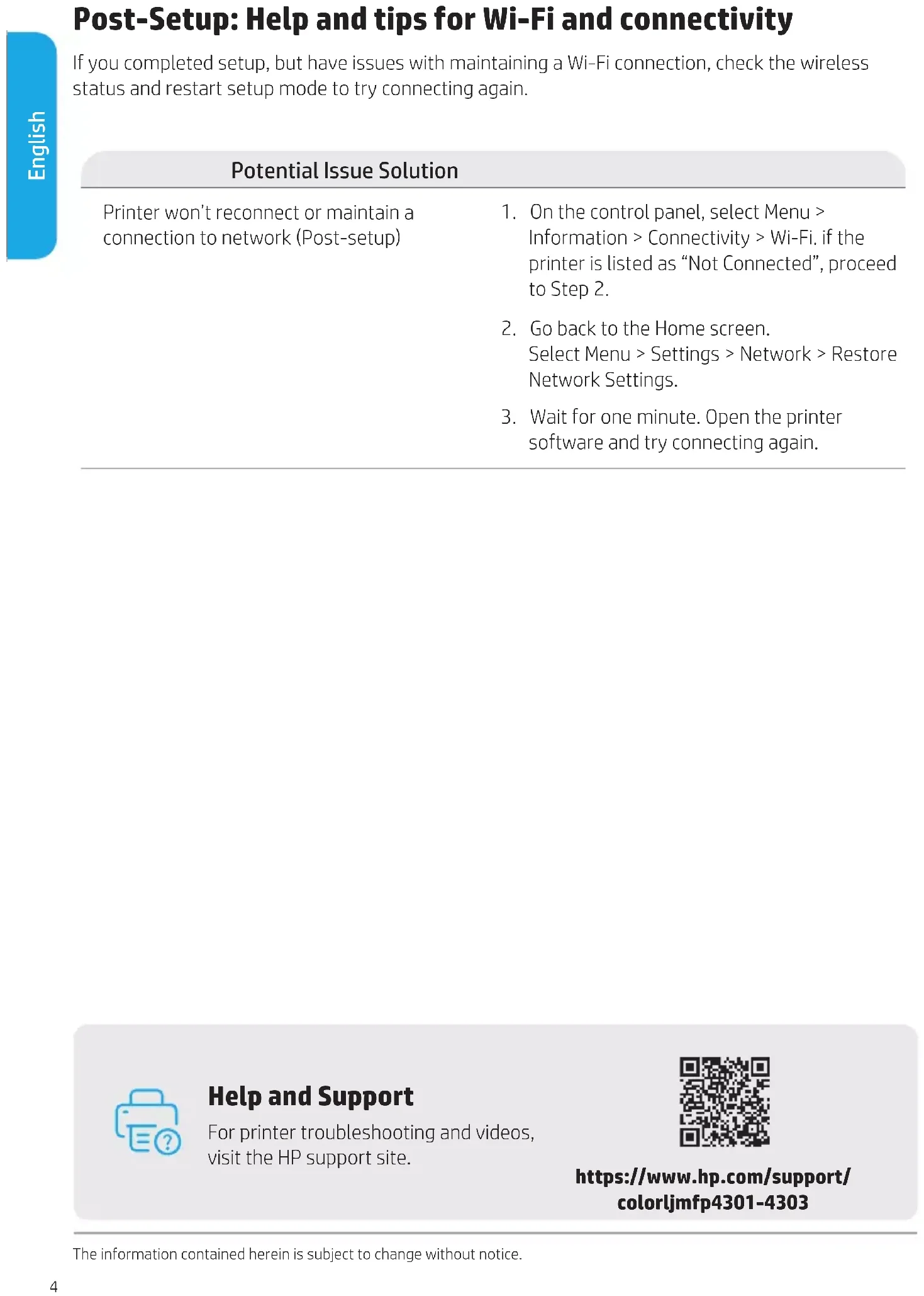 software and try connecting again. https://www.hp.com/support/ colorljmfp4301-4303 Help and Support For printer troubleshooting and videos, visit the HP support site. The information contained herein is subject to change without notice. English5 Français Panneau de commande Aide pour le chargement de papier Pour charger du papier au format Legal, pressez le loquet derrière l’avant du bac et tirez vers l’avant. Le bac2 s’étirera depuis l’avant de l’imprimante d’environ 2pouces (51mm). Pour plus d’informations d’aide spéciques à l’imprimante, consultez hp.com/support/colorljmfp4301-4303. Tableau de bord Ouvrez le tableau de bord en touchant ou en balayant le haut de l’écran pour accéder aux tâches et à l’état de l’imprimante. Menu Affichez toutes les capacités d’impression. Se connecter/se déconnecter Fournit un contrôle d’accès à l’imprimante. Tâche Impression Numérisation Copie Télécopie USB Aide Papier6 Français Caractéristiques de l’imprimante