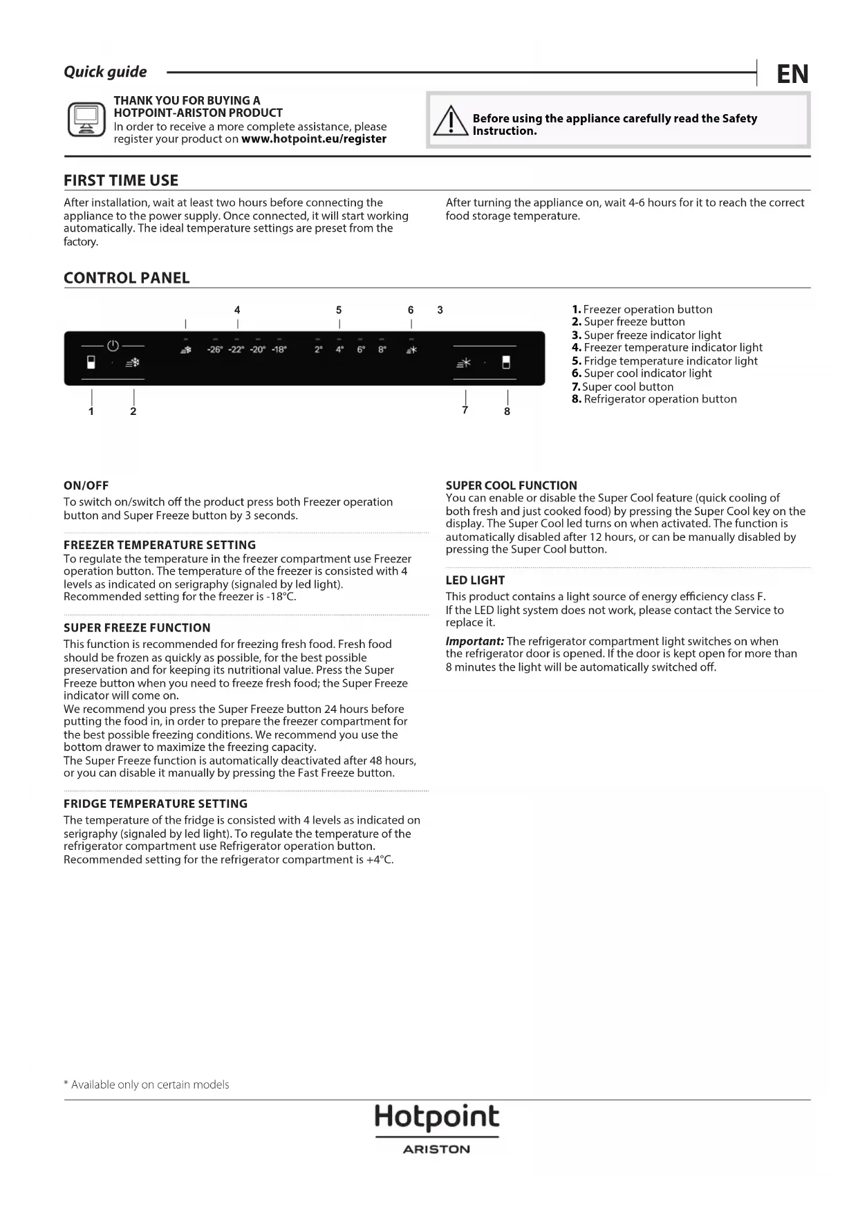 PRODUIT HOTPOINT-ARISTON An de proter d’une assistance complète, veuillez enregistrer votre produit sur www . hotpoint .eu/ register Lisez attentivement les consignes de sécurité avant d’utiliser l’appareil. 1ÈRE UTILISATION Attendre au moins deux heures après l’installation avant de brancher l’appareil à l’alimentation électrique. Une fois branché, il commencera à fonctionner automatiquement. Les réglages de la température idéale sont préréglés à l’usine. Après avoir allumé l’appareil, attendre 4-6 heures pour qu’il atteigne la température correcte pour la conservation des aliments.