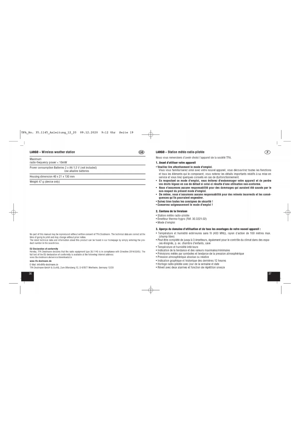 - Réveil avec deux alarmes et fonction de répétition snooze TFA_No. 35.1145_Anleitung_12_20 09.12.2020 9:12 Uhr Seite 193938 LARGO – Station météo radio-pilotée
