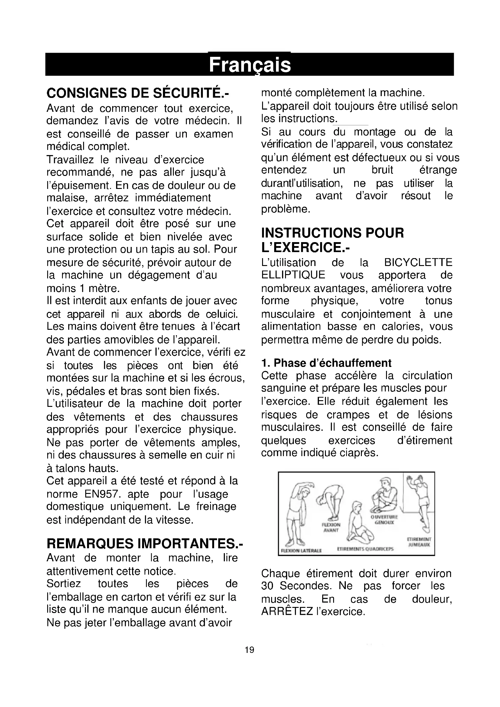 Avant de commencer tout exercice, demandez l’avis de votre médecin. Il est conseillé de passer un examen médical complet. Travaillez le niveau d’exercice recommandé, ne pas aller jusqu’à l’épuisement. En cas de douleur ou de malaise, arrêtez immédiatement l’exercice et consultez votre médecin. Cet appareil doit être posé sur une surface solide et bien nivelée avec une protection ou un tapis au sol. Pour mesure de sécurité, prévoir autour de la machine un dégagement d’au moins 1 mètre. Il est interdit aux enfants de jouer avec cet appareil ni aux abords de celuici. Les mains doivent être tenues à l’écart des parties amovibles de l’appareil. Avant de commencer l’exercice, vérifi ez si toutes les pièces ont bien été montées sur la machine et si les écrous, vis, pédales et bras sont bien fixés. L’utilisateur de la machine doit porter des vêtements et des chaussures appropriés pour l’exercice physique. Ne pas porter de vêtements amples, ni des chaussures à semelle en cuir ni à talons hauts. Cet appareil a été testé et répond à la norme EN957. apte pour l’usage domestique uniquement. Le freinage est indépendant de la vitesse. REMARQUES IMPORTANTES.- Avant de monter la machine, lire attentivement cette notice. Sortiez toutes les pièces de l’emballage en carton et vérifi ez sur la liste qu’il ne manque aucun élément. Ne pas jeter l’emballage avant d’avoir monté complètement la machine. L’appareil doit toujours être utilisé selon les instructions. Si au cours du montage ou de la vérification de l’appareil, vous constatez qu’un élément est défectueux ou si vous entendez un bruit étrange durantl’utilisation, ne pas utiliser la machine avant d’avoir résout le problème. INSTRUCTIONS POUR L’EXERCICE.- L’utilisation de la BICYCLETTE ELLIPTIQUE vous apportera de nombreux avantages, améliorera votre forme physique, votre tonus musculaire et conjointement à une alimentation basse en calories, vous permettra même de perdre du poids.