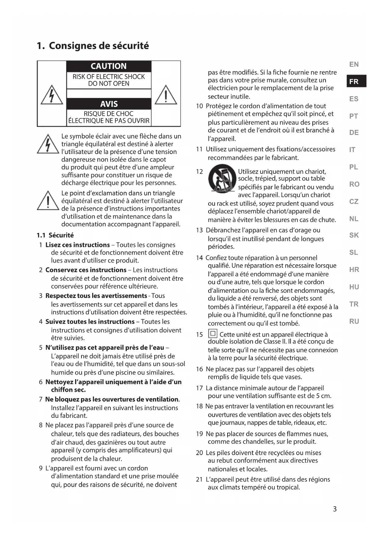 1 Lisez ces instructions – Toutes les consignes de sécurité et de fonctionnement doivent être lues avant d’utiliser ce produit. 2 Conservez ces instructions – Les instructions de sécurité et de fonctionnement doivent être conservées pour référence ultérieure. 3 Respectez tous les avertissements - Tous les avertissements sur cet appareil et dans les instructions d’utilisation doivent être respectées. 4 Suivez toutes les instructions – Toutes les instructions et consignes d’utilisation doivent être suivies. 5 N’utilisez pas cet appareil près de l’eau – L’appareil ne doit jamais être utilisé près de l’eau ou de l’humidité, tel que dans un sous-sol humide ou près d’une piscine ou similaires. 6 Nettoyez l’appareil uniquement à l’aide d’un chiffon sec. 7 Ne bloquez pas les ouvertures de ventilation. Installez l’appareil en suivant les instructions du fabricant. 8 Ne placez pas l’appareil près d’une source de chaleur, tels que des radiateurs, des bouches d’air chaud, des gazinières ou tout autre appareil (y compris des amplificateurs) qui produisent de la chaleur. 9 L’appareil est fourni avec un cordon d’alimentation standard et une prise moulée qui, pour des raisons de sécurité, ne doivent