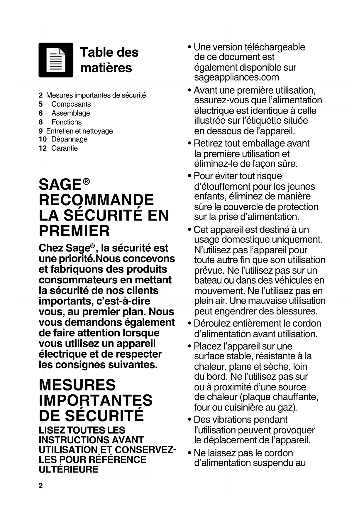 2 Mesures importantes de sécurité5 Composants6 Assemblage8 Fonctions9 Entretien et nettoyage10 Dépannage12 Garantie Table des matières SAGE