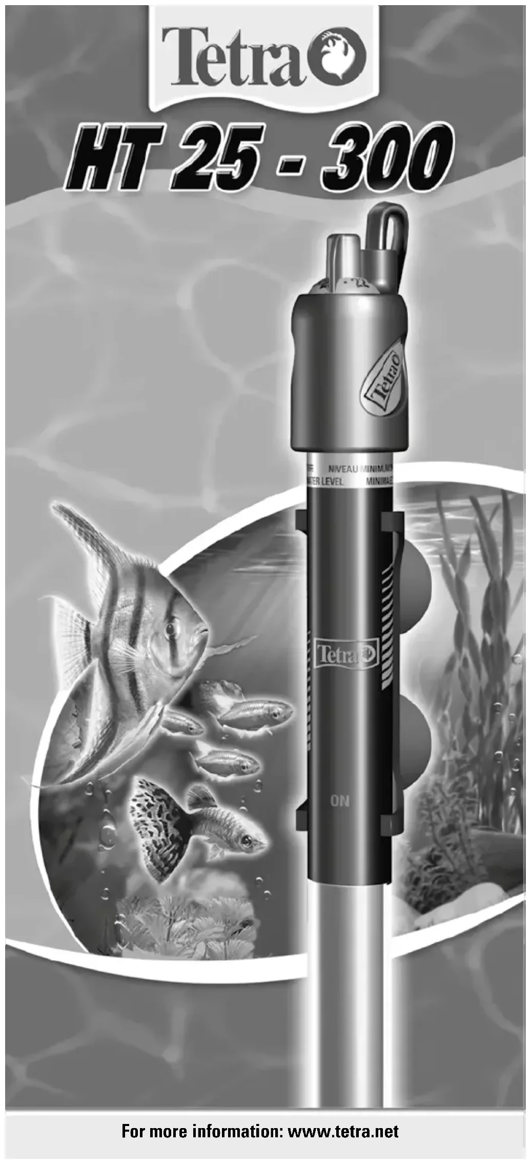 branchez la prise sur le secteur. Il faut quelques minutes pour que le thermostat ait enregistré la température de l’eau. En cas d’écart de ± 0,25 degrés Celsius par rapport à la température souhaitée, l’appareil se met automatiquement en route ou s’arrête. Le chauage Tetra HT veille donc automatiquement au maintien de la température souhaitée. Le témoin de contrôle lumineux s’allume pour indiquer que l’appareil est en train de chauer l’eau. Le chauage Tetra HT est équipé d’un thermostat et il est extrêmement précis. Des écarts mineurs peuvent apparaître occasionnellement entre le réglage de température du chauage et la valeur indiquée par un thermomètre d’aquarium traditionnel. Maintenance Pour chauer l’eau ecacement, il faut de temps en temps enlever les dépôts calcaires du tube de verre. Débranchez le chauage du secteur, laissez-le refroidir pendant une quinzaine de minutes et nettoyez-le uniquement avec de l’eau et du vinaigre. N’utilisez ni détergents, ni solvants, ni acides. Consignes de sécurité Important ! Le chauage HT ne doit être raccordé au secteur que s’il est plongé dans l’eau au moins jusqu’au niveau « minimum water level ». Débranchez le chauage et tous les appareils électriques du secteur avant de plonger la main dans l’eau ! Après l’avoir débranché, laissez refroidir le chauage pendant 15 minutes avant de l’enlever ou avant de vider l’eau à un niveau inférieur au niveau « minimum water level ». Le chauage HT ne doit être utilisé que dans des aquariums. Le cordon de branchement ne peut pas être remplacé. En cas de détérioration, l’appareil ne doit plus être utilisé. Veillez à ce que le niveau de l’eau ne descende jamais en dessous du niveau « minimum water level ». Cet appareil n’est pas conçu pour les personnes (notamment les enfants) à capacités physiques, sensorielles ou mentales réduites, ou sans expérience ni connaissances préalables, sauf si une personne responsable de leur sécurité assure une surveillance appropriée ou leur donne des instructions pour utiliser l’appareil. Attention, les enfants ne doivent pas jouer avec l’appareil. Cet appareil doit être alimenté par un dispositif diérentiel résiduel (DDR ou RCD) délivrant un courant diérentiel de fonctionnement assigné de 30 mA maximum. Garanti 2 ans Grâce à des techniques de fabrication modernes, à des composants performants et à un contrôle qualité très strict, nous sommes en mesure de proposer une garantie de deux ans à compter de la date d’achat sur les chauages Tetra HT. Cette garantie couvre toutes les déficiences importantes de l’appareil qui seraient dues de manière avérée à des défauts de matériaux ou de fabrication. Elle s’exerce, à notre discrétion, par le remplacement de l’appareil par un autre ou par la réparation gratuite de l’appareil envoyé. Le recours à la garantie est exclu en cas d’utilisation incorrecte, de bris du tube en verre, ainsi que pour les dégâts provoqués par l’appareil. Cette garantie fabricant n’aecte pas les droits de garantie à l’égard du commerçant/ revendeur. Pour toute réclamation, veuillez vous adresser directement à votre revendeur ou au service après-vente Tetra France (numéro azur ci-dessous) en n’oubliant pas de vous munir de votre preuve d’achat. Tetra GmbH, Herrenteich 78 D-49324 Melle, Allemagne www.tetra.net FGebruiks- instructies Gefeliciteerd met de aankoop van uw Tetra aquariumverwarmer. Deze TÜV-beproefde aquariumverwarmer is gemaakt van topkwaliteitsmaterialen en is uitgerust met de modernste technologie voor aquariumverwarmers. Daardoor zijn de precisie, de betrouwbaarheid en de veiligheid gegarandeerd. Deze gemakkelijk te gebruiken aquariumverwarmer moet u gewoon installeren en voor de rest hoeft u er zich niet meer om te bekommeren. U kunt ervan op aan dat de watertemperatuur op het gewenste niveau wordt gehouden en u hebt alle tijd om van uw vissen te genieten. Neem de volgende instructies in acht, wanneer u uw Tetra aquariumverwarmer installeert en gebruikt: