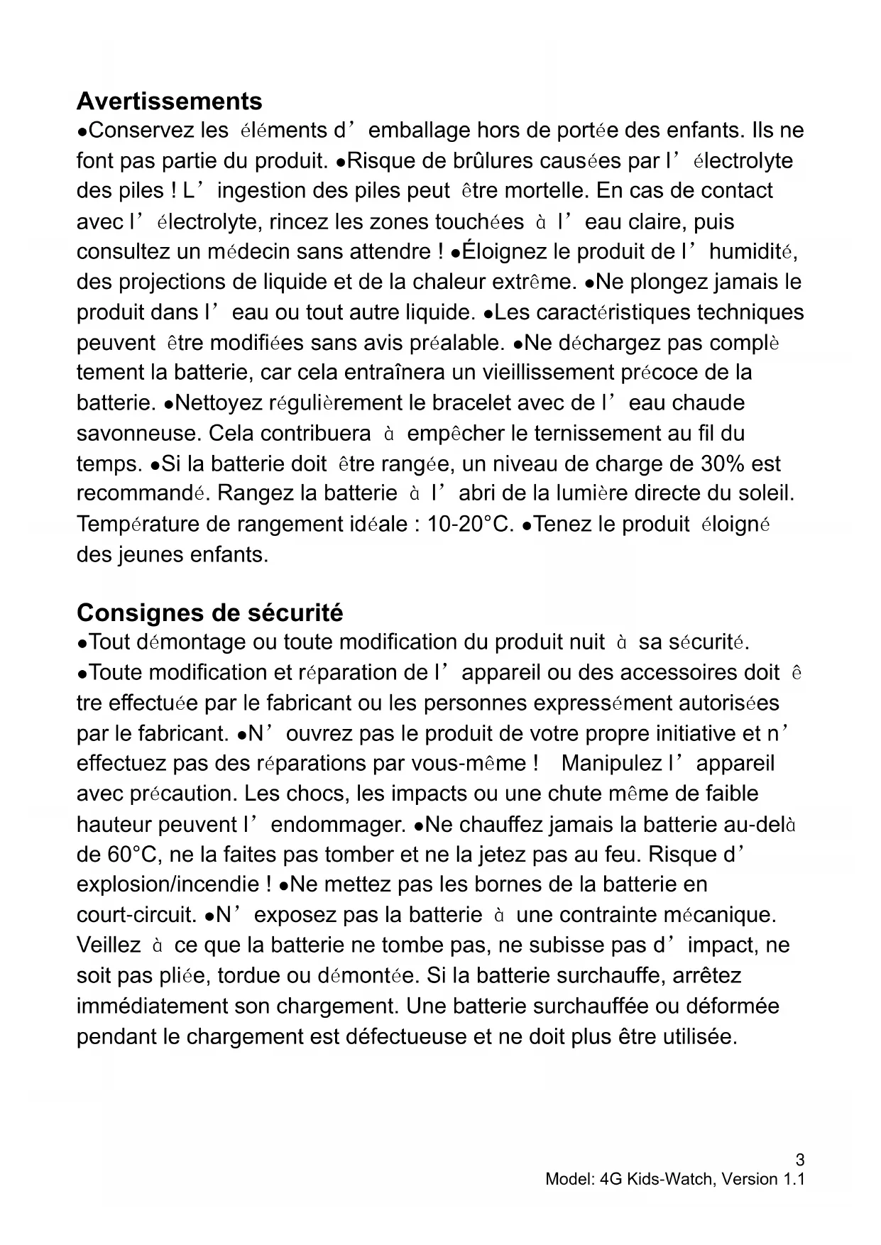- Manuel d’utilisation Montre pour enfants 4G avec mesure de la température et géolocalisation GPS Lisez attentivement le mode d’emploi avant la première utilisation. Cet appareil n’est pas prévu pour être utilisé par les personnes (enfants inclus) souffrant de capacités physiques, sensorielles ou mentales réduites, ou par les personnes manquant d’expérience ou de connaissances, à moins qu’elles le fassent sous la supervision ou avec les explications d’une personne responsable de leur sécurité. Les enfants doivent être toujours sous surveillance d’un adulte lors de l’utilisation du produit. Ne convient pas aux enfants de moins de 3 ans. Conservez soigneusement ce manual d’utilisation pour références ultérieure ou pour le partage du produit. Faites de même avec les accessoires d’origine pour ce produit. En case de garantie, veuillez contacter le revendeur ou le magasin où vous avez achéte ce produit. Profitez de votre produit. Partagez votre expérience et opinion sur l’un des portails internet connus.2 Model: 4G Kids-Watch, Version 1.1 Table des matières Avertissements ........................... 3 Consignes de sécurité ................ 3 Caractéristiques ......................... 4 Présentation du produit .............. 4 Caractéristiques techniques ....... 4 Contenu de la boîte .................... 5 Spécification de la carte SIM ...... 5 Préparer la carte SIM .............. 5 Installer la carte SIM ............... 6 Fonction des boutons ................. 6 Bouton SOS ............................ 6 Bouton Marche / Retour .......... 6 En charge ................................... 6 Télécharger l’application 4G Locafind ...................................... 7 Procédure d’activation ............ 7 Entretien et maintenance ........... 7 Menu de la montre 4G pour enfants ........................................ 8 Chat ........................................ 8 Contacts .................................. 8 Appel vidéo ............................. 9 Vidéo ....................................... 9 Caméra ................................... 9 Photos ..................................... 9 Fitness .................................... 9 Réglages ............................... 10 Général ............................. 10 Son .................................... 10 Ecran ................................. 10 Fond d’écran ...................... 11 Menu .................................. 11 Identifiant du tracker ........... 11 Réseau ............................... 11 À propos de l’appareil ....... 12 Outils ..................................... 12 Amis .................................. 12 Température ......................... 13 Valeurs vitales ....................... 14 Application 4G LocaFind .......... 15 Tracker (Page d'accueil) ....... 15 Chat ...................................... 15 Messages ............................. 16 Moi (Réglages du compte) .... 17 Informations sur l'enfant (Tracker) ............................... 18 Liste de trackers ................... 19 Localisation ........................... 19 Appeler ................................. 19 Accès .................................... 20 Plus ....................................... 20 Carte ..................................... 22 Localisation ........................... 23 Valeurs vitales ....................... 24 Pas (fitness) ...................... 25 Fréquence cardiaque ........ 25 Pression artérielle ............. 26 Température corporelle ..... 26 Oxygène sanguin .............. 27 Déclaration de Conformité ........ 28 Pris en charge .......................... 28 Élimination ................................ 293 Model: 4G Kids-Watch, Version 1.1 Avertissements ●Conservez les éléments d’emballage hors de portée des enfants. Ils ne font pas partie du produit. ●Risque de brûlures causées par l’électrolyte des piles ! L’ingestion des piles peut être mortelle. En cas de contact avec l’électrolyte, rincez les zones touchées à l’eau claire, puis consultez un médecin sans attendre ! ●Éloignez le produit de l’humidité, des projections de liquide et de la chaleur extrême. ●Ne plongez jamais le produit dans l’eau ou tout autre liquide. ●Les caractéristiques techniques peuvent être modifiées sans avis préalable. ●Ne déchargez pas complè tement la batterie, car cela entraînera un vieillissement précoce de la batterie. ●Nettoyez régulièrement le bracelet avec de l’eau chaude savonneuse. Cela contribuera à empêcher le ternissement au fil du temps. ●Si la batterie doit être rangée, un niveau de charge de 30% est recommandé. Rangez la batterie à l’abri de la lumière directe du soleil. Température de rangement idéale : 10-20°C. ●Tenez le produit éloigné des jeunes enfants. Consignes de sécurité ●Tout démontage ou toute modification du produit nuit à sa sécurité. ●Toute modification et réparation de l’appareil ou des accessoires doit ê tre effectuée par le fabricant ou les personnes expressément autorisées par le fabricant. ●N’ouvrez pas le produit de votre propre initiative et n’ effectuez pas des réparations par vous-même ! Manipulez l’appareil avec précaution. Les chocs, les impacts ou une chute même de faible hauteur peuvent l’endommager. ●Ne chauffez jamais la batterie au-delà de 60°C, ne la faites pas tomber et ne la jetez pas au feu. Risque d’ explosion/incendie ! ●Ne mettez pas les bornes de la batterie en court-circuit. ●N’exposez pas la batterie à une contrainte mécanique. Veillez à ce que la batterie ne tombe pas, ne subisse pas d’impact, ne soit pas pliée, tordue ou démontée. Si la batterie surchauffe, arrêtez immédiatement son chargement. Une batterie surchauffée ou déformée pendant le chargement est défectueuse et ne doit plus être utilisée.4 Model: 4G Kids-Watch, Version 1.1 Caractéristiques