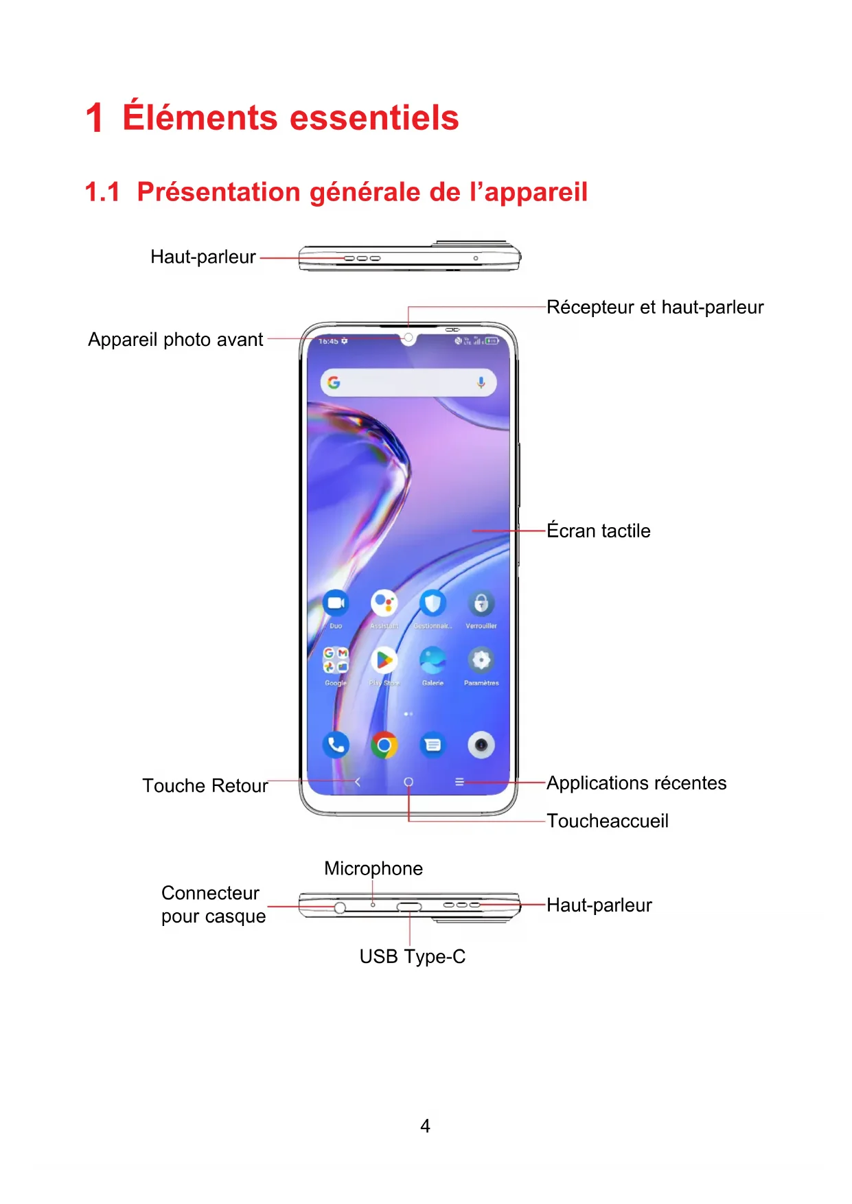 Récepteur et haut-parleur USB Type-C Connecteur pour casque Appareil photo avant Touche Retour Toucheaccueil Écran tactile Applications récentes Haut-parleur Microphone Haut-parleur5 Appareil photo arrière Flash Touche Alimentation et lecteur d’empreintes digitales Emplacements pour carte SIM/ carte microSD Touches de volume Touche Retour