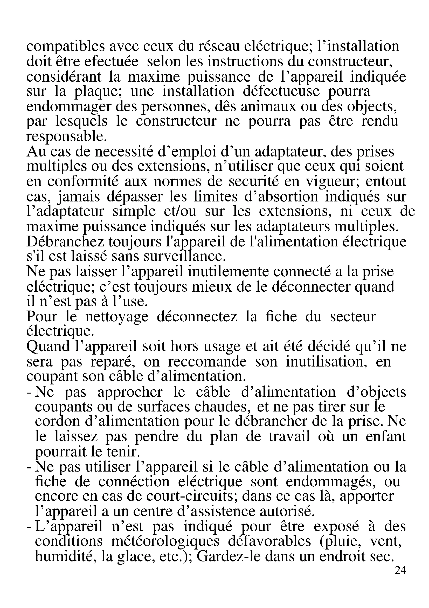 FRANCAIS: ADVERTISSEMENT Les indications suivantes sont très importantes en ce qui concerne l’installation, usage et manutention de cet appareil; gardez soigneusement ce manuel pour des futures consultations; n’utilisez pas l’appareil que selon les indications de ce manuel d’instructions; n’importe quel autre type d’ utilisation devra être consideré inaproprié et potentiellement dangereux; pour cette raison le constructeur ne pourra pas être rendu responsable si des dommages résultants de l’utilisation inapropriée ou irresponsable de l’appareil se produisent. Avant de l’utilisation, certifiez-vous de l’integrité de l’appareil; en cas de doute ne l’utilisez pas et addressez- vous a l’assistence téchnique autoriséa; ne laissez pas des parties de l’emballage (sacs de plastique, polystirène, ongles, agrafages, etc.) à la portée des enfants, car elles constituent des potentielles sources de danger; en autre, il faut rappeler que ces parties doivent être objet de collècte differencié de résidus. Certifiez-vous que les donnés constants de la plaque sont24 compatibles avec ceux du réseau eléctrique; l’installation doit être efectuée selon les instructions du constructeur, considérant la maxime puissance de l’appareil indiquée sur la plaque; une installation défectueuse pourra endommager des personnes, dês animaux ou des objects, par lesquels le constructeur ne pourra pas être rendu responsable. Au cas de necessité d’emploi d’un adaptateur, des prises multiples ou des extensions, n’utiliser que ceux qui soient en conformité aux normes de securité en vigueur; entout cas, jamais dépasser les limites d’absortion indiqués sur l’adaptateur simple et/ou sur les extensions, ni ceux de maxime puissance indiqués sur les adaptateurs multiples. Débranchez toujours l'appareil de l'alimentation électrique s'il est laissé sans surveillance. Ne pas laisser l’appareil inutilemente connecté a la prise eléctrique; c’est toujours mieux de le déconnecter quand il n’est pas à l’use. Pour le nettoyage déconnectez la fiche du secteur électrique. Quand l’appareil soit hors usage et ait été décidé qu’il ne sera pas reparé, on reccomande son inutilisation, en coupant son câble d’alimentation. - Ne pas approcher le câble d’alimentation d’objects coupants ou de surfaces chaudes, et ne pas tirer sur le cordon d’alimentation pour le débrancher de la prise. Ne le laissez pas pendre du plan de travail où un enfant pourrait le tenir. - Ne pas utiliser l’appareil si le câble d’alimentation ou la fiche de connéction eléctrique sont endommagés, ou encore en cas de court-circuits; dans ce cas là, apporter l’appareil a un centre d’assistence autorisé. - L’appareil n’est pas indiqué pour être exposé à des conditions météorologiques défavorables (pluie, vent, humidité, la glace, etc.); Gardez-le dans un endroit sec.25 Jamais opérer ou même toucher l’appareil avec les mains mouillées ou les pieds nus. - Ce produit ne doit pas être utilisé par les enfants, même s'ils ont plus de 8 ans. - Cet appareil peut être utilisé par des personnes ayant des capacités physiques, sensorielles ou mentales réduites, ou qui manquent d'expérience ou de connaissances, si elles ont été correctement supervisées ou ont reçu des instructions pour utiliser cet appareil en toute sécurité. - Les enfants ne doivent pas jouer avec cet appareil. - Gardez l’appareil et le câble d’alimentation hors la portée des enfants agés de moins de 8 ans. Si le câble d'alimentation est endommagé ou en cas de panne et / ou de dysfonctionnement, ne modifiez pas l'appareil. Toute réparation doit être effectuée par le fabricant ou par son service d'assistance technique ou, en tout cas, par une personne possédant une qualification similaire, afin d'éviter tout risque. Le non-respect de ce qui précède peut compromettre la sécurité de l'appareil et invalider les conditions de la garantie. ATTENTION: Cet appareil comporte une fonction de chauffage. Quelques surfaces, même si non la plaque elle même, pourront atteindre des températures élevées. Étant donné que la sensibilité à la température diffère de personne à personne, cet appareil devrà être usé avec PRUDENCE. Placez l’appareil sur des surfaces adéhrentes et préparées pour cet effet, et utilisez les mésures de protection contre la chaleur conseillées. - Cet appareil est destiné à être utilisé dans les ménages et des applications similaires: les cuisines du personnel dans les magasins, bureaux et autres environnements de travail, pour les clients dans les hôtels, motels et autres environnements de type résidentiel, de type lit et petit- déjeuner, hébergement. - L’appareil n’est pas conçu pour être utilisé avec une26 minuterie extérieure ou un commande à distance. - N’utiliser que des accéssoires e pièces d’origine. - Avant chaque utilisation, effectuez le cordon d'alimentation. Ne soumettez pas le produit à des chocs susceptibles de l'endommager. - Tenir l’appareil à l’écart des environnements où il peut y avoir des gaz, vapeurs, des substances inflammables ou explosives.