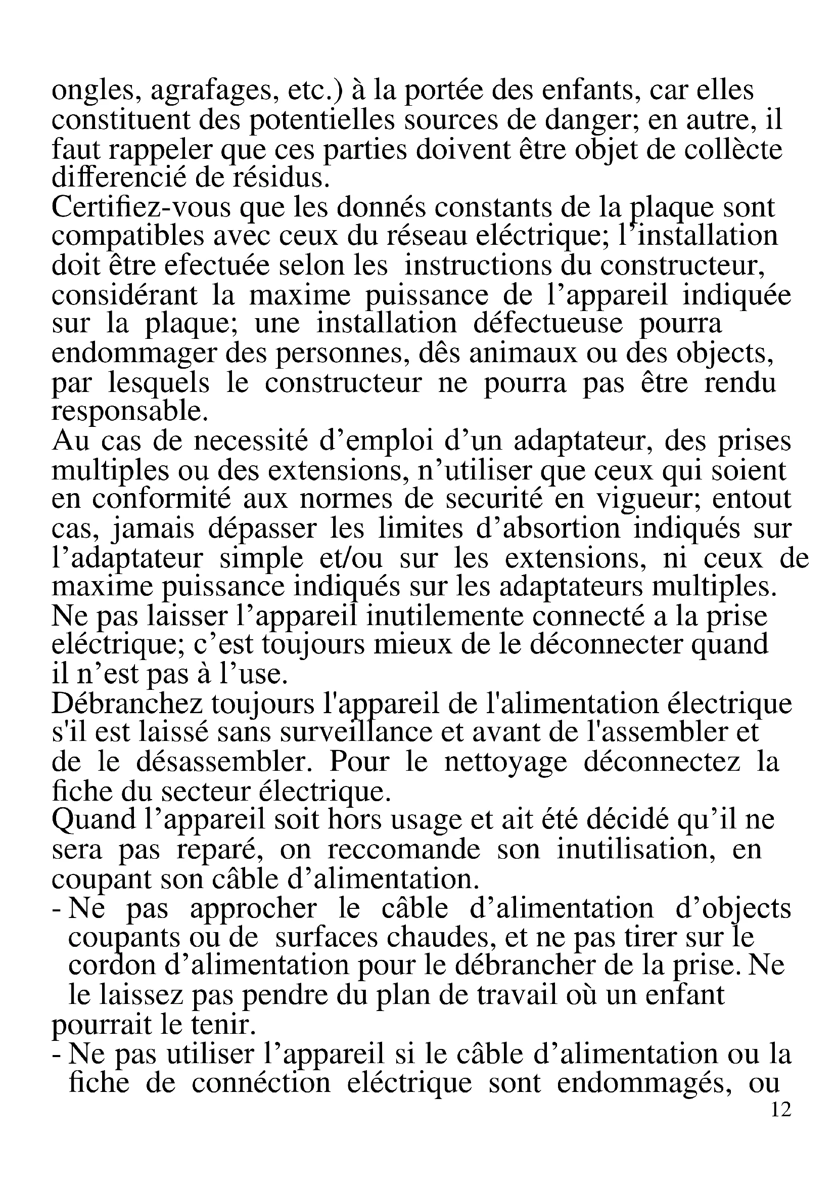 Les indications suivantes sont très importantes en ce qui concerne l’installation, usage et manutention de cet appareil; gardez soigneusement ce manuel pour des futures consultations; n’utilisez pas l’appareil que selon les indications de ce manuel d’instructions; n’importe quel autre type d’ utilisation devra être consideré inaproprié et potentiellement dangereux; pour cette raison le constructeur ne pourra pas être rendu responsable si des dommages résultants de l’utilisation inapropriée ou irresponsable de l’appareil se produisent. Avant de l’utilisation, certifiez-vous de l’integrité de l’appareil; en cas de doute ne l’utilisez pas et addressez- vous a l’assistence téchnique autoriséa; ne laissez pas des parties de l’emballage (sacs de plastique, polystirène,12 ongles, agrafages, etc.) à la portée des enfants, car elles constituent des potentielles sources de danger; en autre, il faut rappeler que ces parties doivent être objet de collècte differencié de résidus. Certifiez-vous que les donnés constants de la plaque sont compatibles avec ceux du réseau eléctrique; l’installation doit être efectuée selon les instructions du constructeur, considérant la maxime puissance de l’appareil indiquée sur la plaque; une installation défectueuse pourra endommager des personnes, dês animaux ou des objects, par lesquels le constructeur ne pourra pas être rendu responsable. Au cas de necessité d’emploi d’un adaptateur, des prises multiples ou des extensions, n’utiliser que ceux qui soient en conformité aux normes de securité en vigueur; entout cas, jamais dépasser les limites d’absortion indiqués sur l’adaptateur simple et/ou sur les extensions, ni ceux de maxime puissance indiqués sur les adaptateurs multiples. Ne pas laisser l’appareil inutilemente connecté a la prise eléctrique; c’est toujours mieux de le déconnecter quand il n’est pas à l’use. Débranchez toujours l'appareil de l'alimentation électrique s'il est laissé sans surveillance et avant de l'assembler et de le désassembler. Pour le nettoyage déconnectez la fiche du secteur électrique. Quand l’appareil soit hors usage et ait été décidé qu’il ne sera pas reparé, on reccomande son inutilisation, en coupant son câble d’alimentation. - Ne pas approcher le câble d’alimentation d’objects coupants ou de surfaces chaudes, et ne pas tirer sur le cordon d’alimentation pour le débrancher de la prise. Ne le laissez pas pendre du plan de travail où un enfant pourrait le tenir. - Ne pas utiliser l’appareil si le câble d’alimentation ou la fiche de connéction eléctrique sont endommagés, ou13 encore en cas de court-circuits; dans ce cas là, apporter l’appareil a un centre d’assistence autorisé. - L’appareil n’est pas indiqué pour être exposé à des conditions météorologiques défavorables (pluie, vent, humidité, la glace, etc.); Gardez-le dans un endroit sec. Jamais opérer ou même toucher l’appareil avec les mains mouillées ou les pieds nus. - Cet appareil peut être utilisé par des enfants agés de plus de 8 ans et par des personnes avec une réduite capacité phisique, sensorial ou mental, ou encore avec peu d’expérience à son usage, pourvu qu’une supervision adéquate leur en soit assuré, ou s’ils auraient été instruits à l’usage de l’appareil en complete securité. Les opérations de nettoyage e de manutention ne oivent pás être efectués par des enfants, sauf pour ceux qui sont agés de plus de 8 ans et sont supervisionés. - Les enfants ne doivent pas jouer avec cet appareil. - Gardez l’appareil et le câble d’alimentation hors la portée des enfants agés de moins de 8 ans. - L’appareil est pour l’usage domestique et intérieur. Au cas de panne et/ou de mauvais fonctionnement, ne pas intervenir sur l’ appareil. Pour une éventuel réparation s’addresser uniquement a un centre autorisé par le constructeur, en demandant dês pièces de remplacement originaux. Le non respect de ces indications peut compromettre la securité de l’appareil e rendre invalides les termes de la garantie. ATTENTION: Cet appareil comporte une fonction de chauffage. Quelques surfaces, même si non la plaque elle même, pourront atteindre des températures élevées. Étant donné que la sensibilité à la température diffère de personne à personne, cet appareil devrà être usé avec PRUDENCE. Placez l’appareil sur des surfaces adéhrentes et préparées pour cet effet, et utilisez les14 mésures de protection contre la chaleur conseillées, comme dês poignées ou des gants de cuisine. - Cet appareil est destiné à être utilisé dans les ménages et des applications similaires: les cuisines du personnel dans les magasins, bureaux et autres environnements de travail, pour les clients dans les hôtels, motels et autres environnements de type résidentiel, de type lit et petit- déjeuner, hébergement. - L’appareil n’est pas conçu pour être utilisé avec une minuterie extérieure ou un commande à distance. - N’utiliser que des accéssoires e pièces d’origine. Avant chaque utilisation, effectuez le cordon d'alimentation. Ne soumettez pas le produit à des chocs susceptibles de l'endommager. Tenir l’appareil à l’écart des environnements où il peut y avoir des gaz, vapeurs, des substances inflammables ou explosives MODE D’EMPLOI. A la première utilisation, nettoyer les pièces qui seront en contact avec les aliments: l'intérieur de la bouilloire. - Jamais activer l'appareil lorsqu'il est encore emballé. - Utilisez la bouilloire uniquement pour chauffer ou faire bouillir l'eau. Remplissez la bouilloire avec de l'eau froide, en prenant soin de rester dans les limites de capacité fixés sur le réservoir (MAX 1.7L, MIN 0.5L). - Toujours verser l'eau avant d'allumer la bouilloire. Ne jamais introduire des liquides après l'allumage. - Si la bouilloire est mise à fonctionner vid