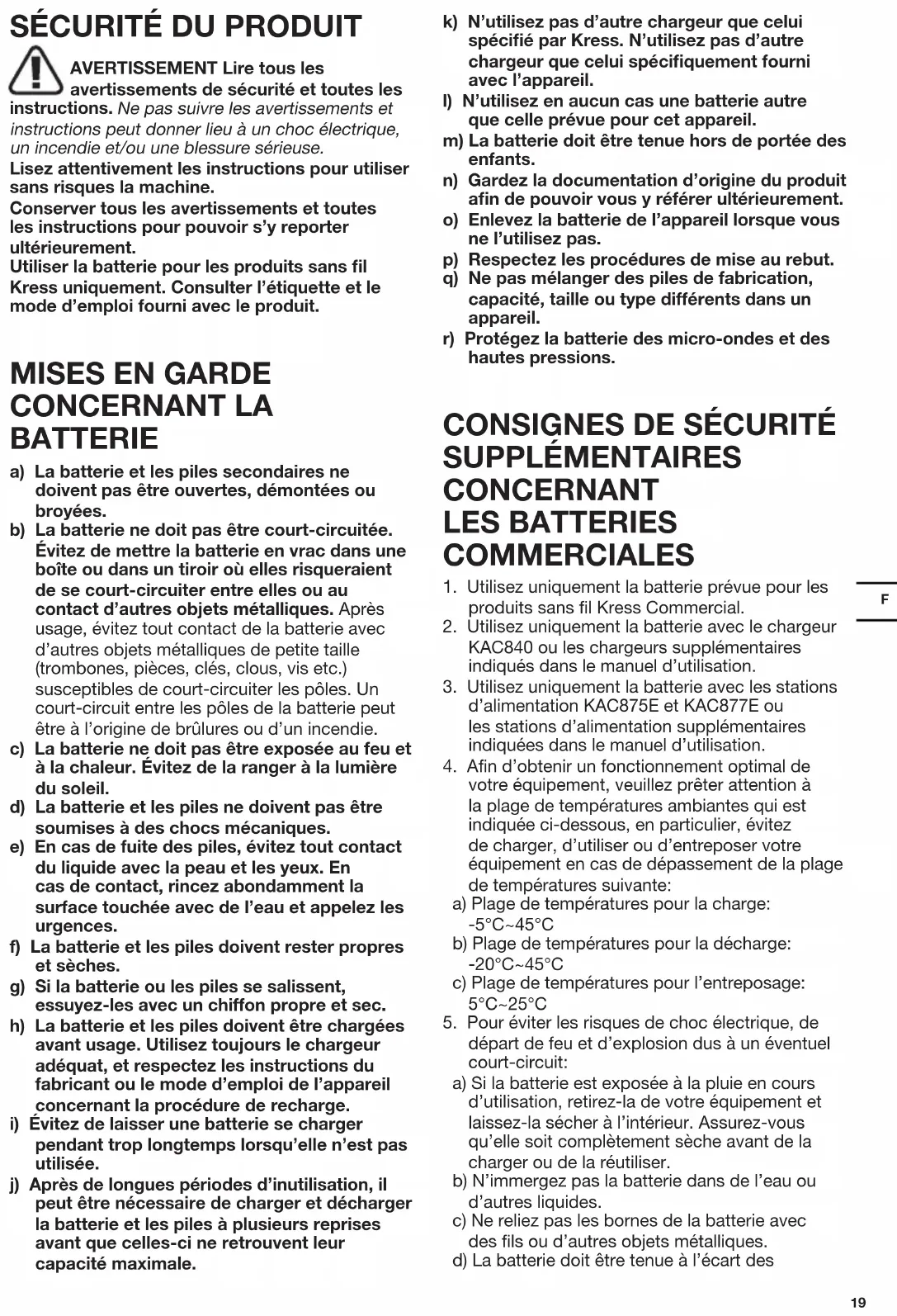 AVERTISSEMENT Lire tous les avertissements de sécurité et toutes les instructions. Ne pas suivre les avertissements et instructions peut donner lieu à un choc électrique, un incendie et/ou une blessure sérieuse. Lisez attentivement les instructions pour utiliser sans risques la machine. Conserver tous les avertissements et toutes les instructions pour pouvoir s’y reporter ultérieurement. Utiliser la batterie pour les produits sans fil Kress uniquement. Consulter l’étiquette et le mode d’emploi fourni avec le produit.