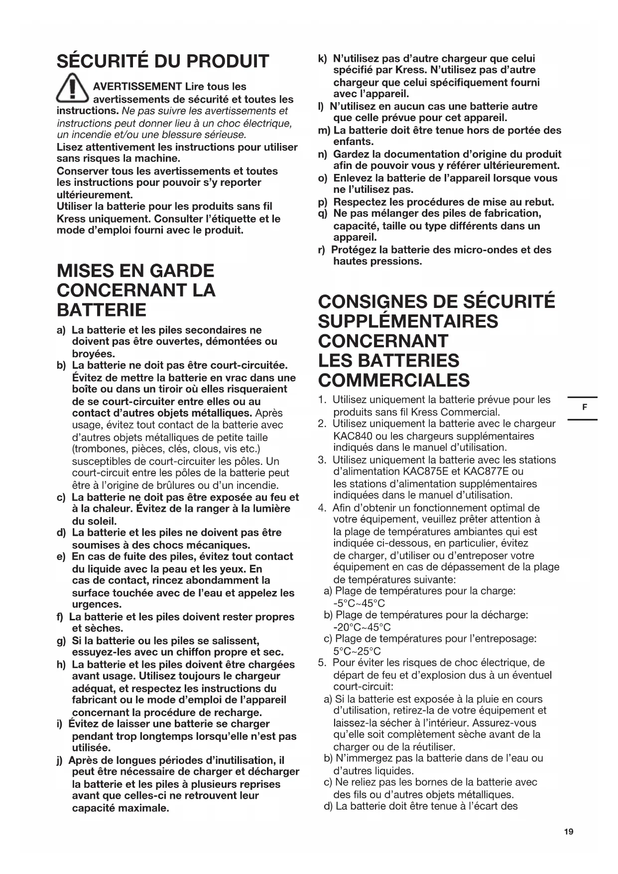 AVERTISSEMENT Lire tous les avertissements de sécurité et toutes les instructions. Ne pas suivre les avertissements et instructions peut donner lieu à un choc électrique, un incendie et/ou une blessure sérieuse. Lisez attentivement les instructions pour utiliser sans risques la machine. Conserver tous les avertissements et toutes les instructions pour pouvoir s’y reporter ultérieurement. Utiliser la batterie pour les produits sans fil Kress uniquement. Consulter l’étiquette et le mode d’emploi fourni avec le produit.