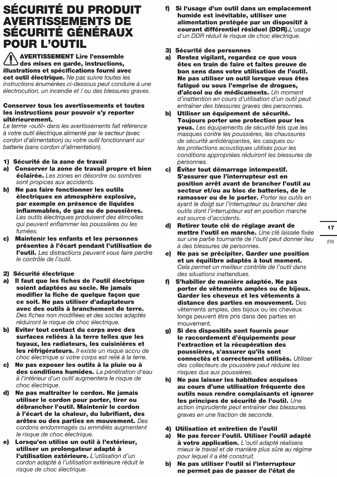 AVERTISSEMENT Lire l’ensemble des mises en garde, instructions, illustrations et spécifications fourni avec cet outil électrique. Ne pas suivre toutes les instructions énumérées ci-dessous peut conduire à une électrocution, un incendie et / ou des blessures graves. Conserver tous les avertissements et toutes les instructions pour pouvoir s’y reporter ultérieurement. Le terme «outil» dans les avertissements fait référence à votre outil électrique alimenté par le secteur (avec cordon d’alimentation) ou votre outil fonctionnant sur batterie (sans cordon d’alimentation).