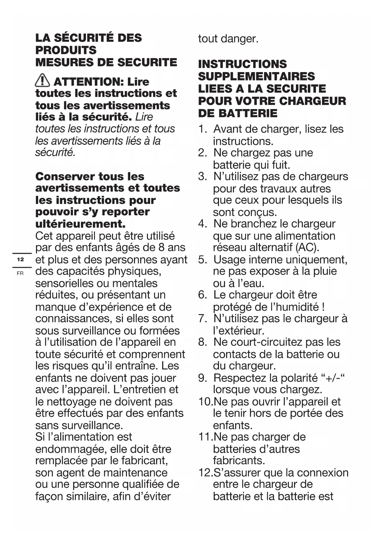 ATTENTION: Lire toutes les instructions et tous les avertissements liés à la sécurité. Lire toutes les instructions et tous les avertissements liés à la sécurité. Conserver tous les avertissements et toutes les instructions pour pouvoir s’y reporter ultérieurement. Cet appareil peut être utilisé par des enfants âgés de 8 ans et plus et des personnes ayant des capacités physiques, sensorielles ou mentales réduites, ou présentant un manque d’expérience et de connaissances, si elles sont sous surveillance ou formées à l’utilisation de l’appareil en toute sécurité et comprennent les risques qu’il entraîne. Les enfants ne doivent pas jouer avec l’appareil. L’entretien et le nettoyage ne doivent pas être effectués par des enfants sans surveillance. Si l’alimentation est endommagée, elle doit être remplacée par le fabricant, son agent de maintenance ou une personne qualiée de façon similaire, an d’éviter tout danger. INSTRUCTIONS SUPPLEMENTAIRES