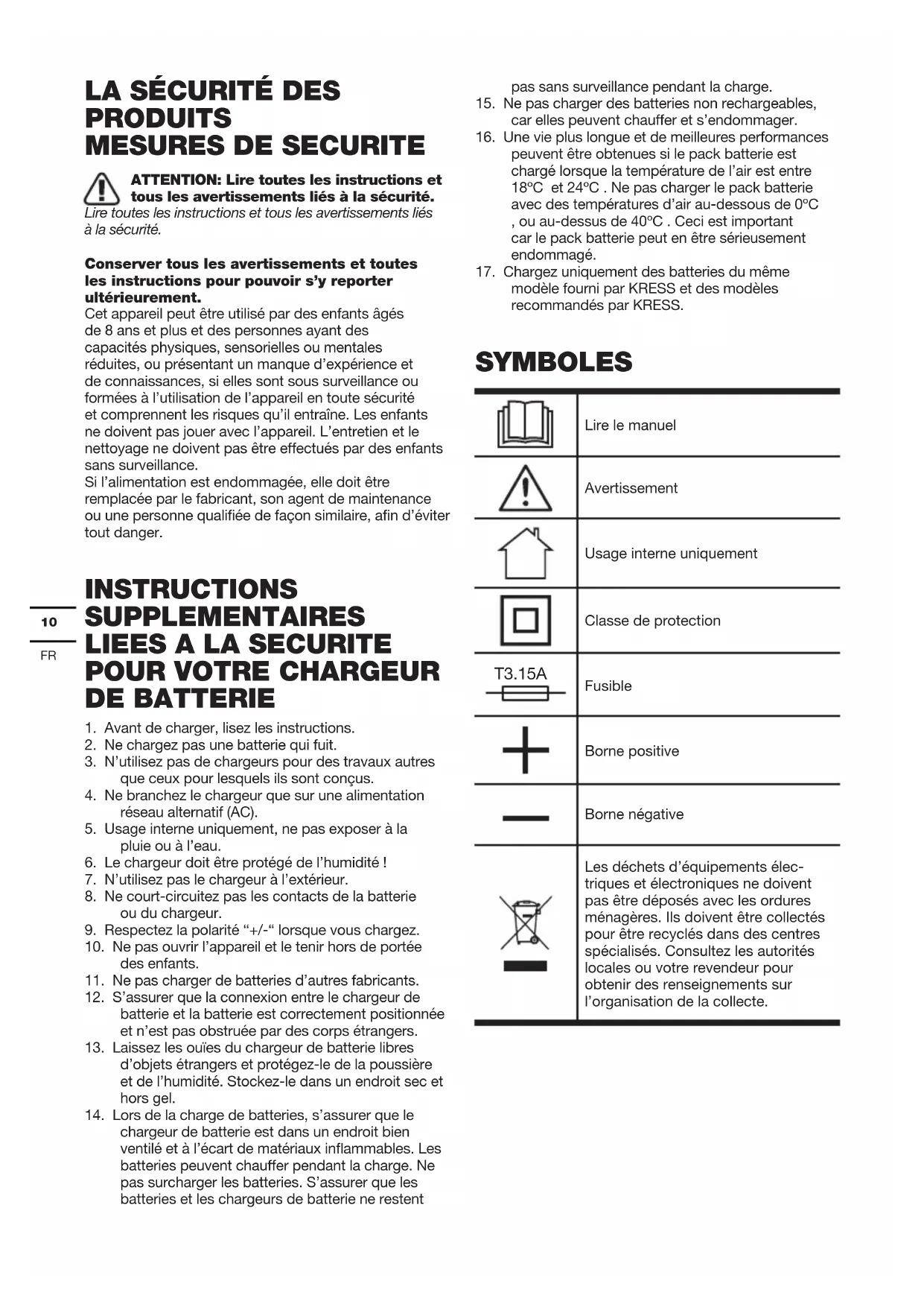modèle fourni par KRESS et des modèles recommandés par KRESS. SYMBOLES Lire le manuel Avertissement Usage interne uniquement Classe de protection T3.15A Fusible Borne positive Borne négative Les déchets d’équipements élec- triques et électroniques ne doivent pas être déposés avec les ordures ménagères. Ils doivent être collectés pour être recyclés dans des centres spécialisés. Consultez les autorités locales ou votre revendeur pour obtenir des renseignements sur l’organisation de la collecte.11