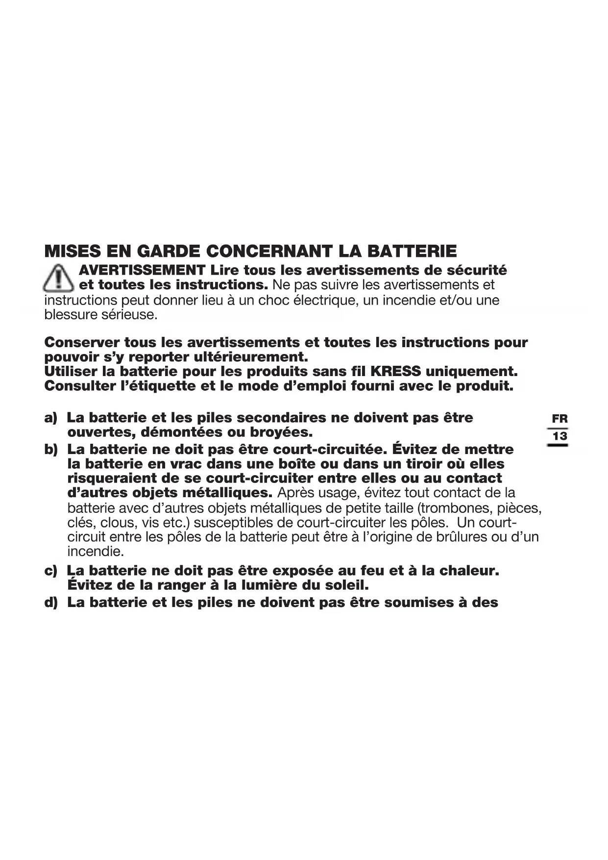 AVERTISSEMENT Lire tous les avertissements de sécurité et toutes les instructions. Ne pas suivre les avertissements et instructions peut donner lieu à un choc électrique, un incendie et/ou une blessure sérieuse. Conserver tous les avertissements et toutes les instructions pour pouvoir s’y reporter ultérieurement. Utiliser la batterie pour les produits sans fil KRESS uniquement. Consulter l’étiquette et le mode d’emploi fourni avec le produit. a) La batterie et les piles secondaires ne doivent pas être ouvertes, démontées ou broyées. b) La batterie ne doit pas être court-circuitée. Évitez de mettre la batterie en vrac dans une boîte ou dans un tiroir où elles risqueraient de se court-circuiter entre elles ou au contact d’autres objets métalliques. Après usage, évitez tout contact de la batterie avec d’autres objets métalliques de petite taille (trombones, pièces, clés, clous, vis etc.) susceptibles de court-circuiter les pôles. Un court- circuit entre les pôles de la batterie peut être à l’origine de brûlures ou d’un incendie. c) La batterie ne doit pas être exposée au feu et à la chaleur. Évitez de la ranger à la lumière du soleil. d) La batterie et les piles ne doivent pas être soumises à des14