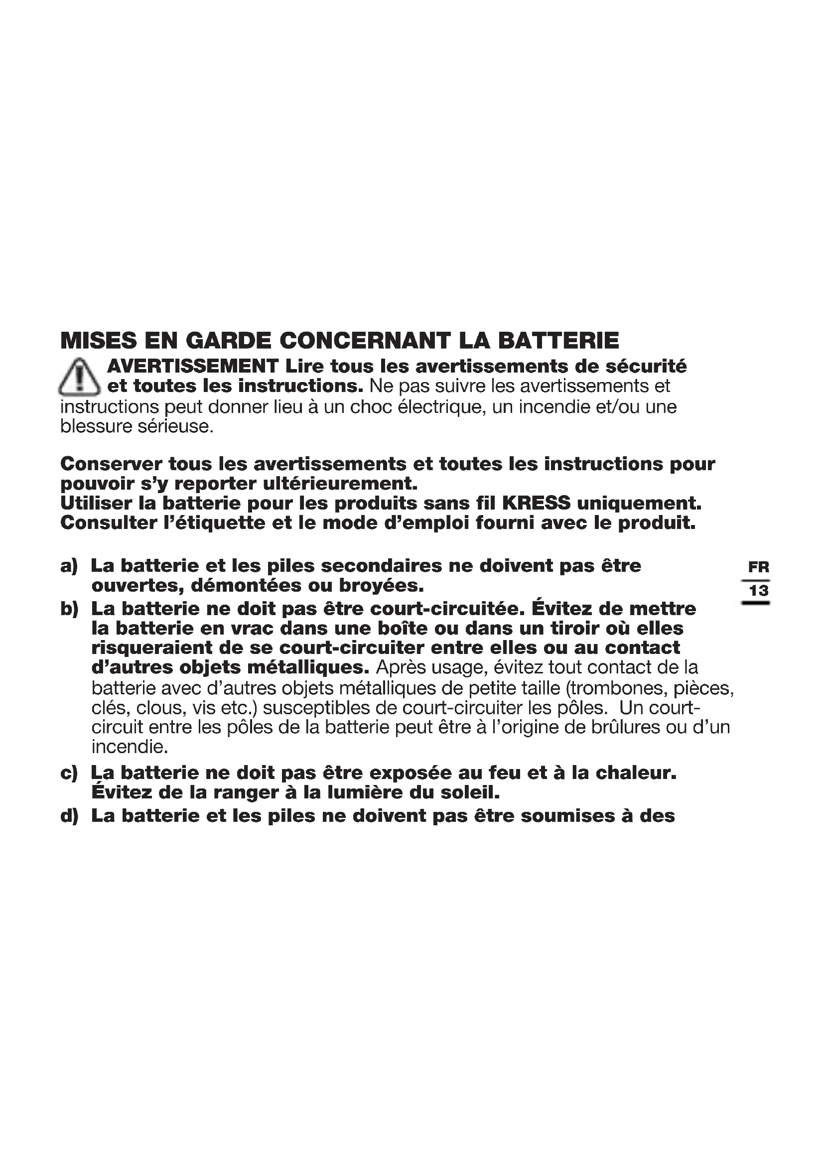 AVERTISSEMENT Lire tous les avertissements de sécurité et toutes les instructions. Ne pas suivre les avertissements et instructions peut donner lieu à un choc électrique, un incendie et/ou une blessure sérieuse. Conserver tous les avertissements et toutes les instructions pour pouvoir s’y reporter ultérieurement. Utiliser la batterie pour les produits sans fil KRESS uniquement. Consulter l’étiquette et le mode d’emploi fourni avec le produit. a) La batterie et les piles secondaires ne doivent pas être ouvertes, démontées ou broyées. b) La batterie ne doit pas être court-circuitée. Évitez de mettre la batterie en vrac dans une boîte ou dans un tiroir où elles risqueraient de se court-circuiter entre elles ou au contact d’autres objets métalliques. Après usage, évitez tout contact de la batterie avec d’autres objets métalliques de petite taille (trombones, pièces, clés, clous, vis etc.) susceptibles de court-circuiter les pôles. Un court- circuit entre les pôles de la batterie peut être à l’origine de brûlures ou d’un incendie. c) La batterie ne doit pas être exposée au feu et à la chaleur. Évitez de la ranger à la lumière du soleil. d) La batterie et les piles ne doivent pas être soumises à des14