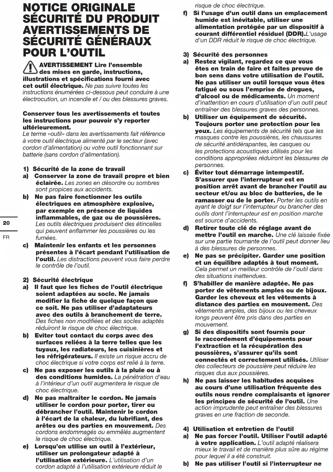 permet pas de passer de l’état de marche à arrêt et vice versa. Tout outil qui ne peut pas être commandé par l’interrupteur est dangereux et il faut le réparer. c) Débrancher la prise de la source d’alimentation et / ou retirer la batterie, si elle est amovible, de l’outil, avant tout réglage, changement d’accessoires ou avant de ranger l’outil. De telles mesures de sécurité préventives réduisent le risque de démarrage accidentel de l’outil. d) Conserver les outils à l’arrêt hors de la portée des enfants et ne pas permettre à des personnes ne connaissant pas l’outil ou les présentes instructions de le faire fonctionner. Les outils sont dangereux entre les mains d’utilisateurs novices. e) Entretenir les outils et accessoires électriques. Vérifier qu’il n’y a pas de mauvais alignement ou de blocage des parties mobiles, des pièces cassées ou toute autre condition pouvant affecter le fonctionnement de l’outil. En cas de dommages, faire réparer l’outil avant de l’utiliser. De nombreux accidents sont dus à des outils mal entretenus. f) Garder affûtés et propres les outils permettant de couper. Des outils destinés à couper correctement entretenus avec des pièces coupantes tranchantes sont moins susceptibles de bloquer et sont plus faciles à contrôler. g) Utiliser l’outil, les accessoires et les lames etc., conformément à ces instructions, en tenant compte des conditions de travail et du travail à réaliser. L’utilisation de l’outil pour des opérations différentes de celles prévues pourrait donner lieu à des situations dangereuses. h) Maintenir les poignées et les surfaces de préhension sèches, propres et exemptes d'huile et de graisse. Des poignées et surfaces de préhension glissantes ne permettent pas une manipulation et un contrôle de l'outil en toute sécurité en cas d’imprévus.