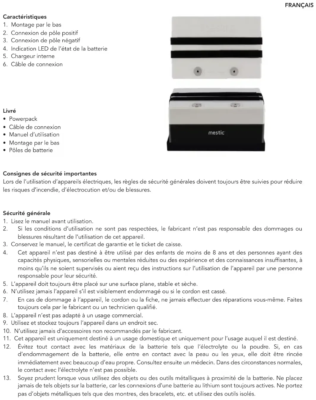 MPM-12 - Batterie portable Mestic - Notice d'utilisation et mode d'emploi gratuit