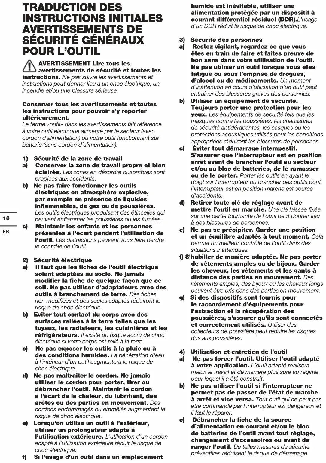 a) Conserver la zone de travail propre et bien éclairée. Les zones en désordre ousombres sont propices aux accidents. b) Ne pas faire fonctionner les outils électriques en atmosphère explosive, par exemple en présence de liquides inflammables, de gaz ou de poussières. Les outils électriques produisent des étincelles qui peuvent enflammer les poussières ou les fumées. c) Maintenir les enfants et les personnes présentes à l’écart pendant l’utilisation de l’outil. Les distractions peuvent vous faire perdre le contrôle de l’outil.
