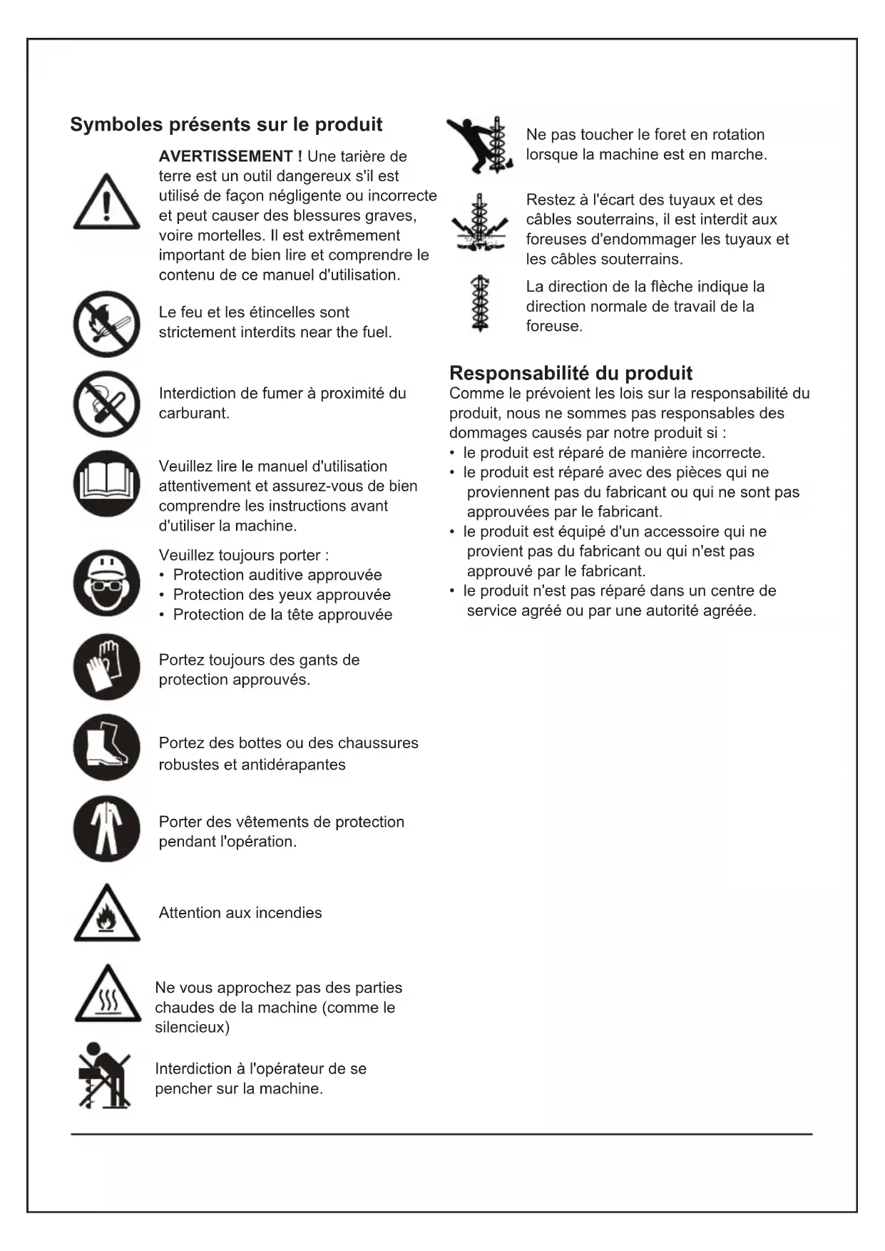 51AVERTISSEMENT ! Une tarière de terre est un outil dangereux s'il est utilisé de façon négligente ou incorrecte et peut causer des blessures graves, voire mortelles. Il est extrêmement important de bien lire et comprendre le contenu de ce manuel d'utilisation. Ne pas toucher le foret en rotation lorsque la machine est en marche. Restez à l'écart des tuyaux et des câbles souterrains, il est interdit aux foreuses d'endommager les tuyaux et les câbles souterrains. La direction de la flèche indique la direction normale de travail de la foreuse. Interdiction à l'opérateur de se pencher sur la machine. Attention aux incendies Ne vous approchez pas des parties chaudes de la machine (comme le silencieux) Responsabilité du produit Comme le prévoient les lois sur la responsabilité du produit, nous ne sommes pas responsables des dommages causés par notre produit si :