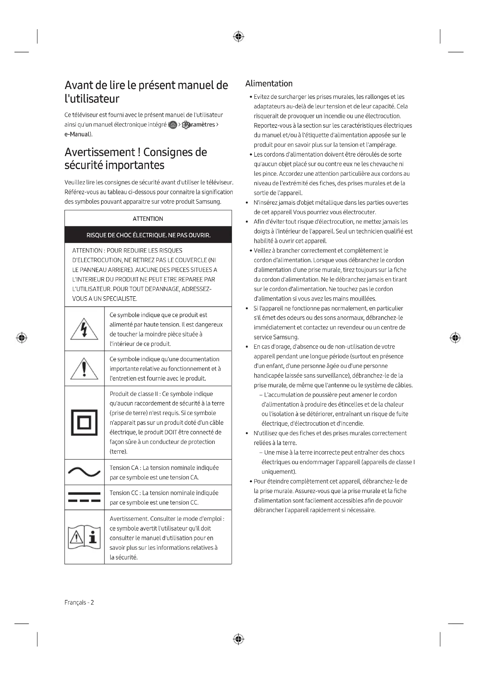 - Aus Sicherheitsgründen dürfen Sie nicht versuchen, den Akku zu entnehmen. Wird der Akku nicht ordnungsgemäß entfernt, kann dies zu Schäden an Akku und Gerät, zu Verletzungen und/oder zu einer Beeinträchtigung der Sicherheit des Geräts führen. Deutsch - 8Diese Seite wurde absichtlich leer belassen.Avant de lire le présent manuel de l'utilisateur Ce téléviseur est fourni avec le présent manuel de l'utilisateur ainsi qu'un manuel électronique intégré ( > Paramètres > e-Manual). Avertissement! Consignes de sécurité importantes Veuillez lire les consignes de sécurité avant d'utiliser le téléviseur. Référez-vous au tableau ci-dessous pour connaitre la signification des symboles pouvant apparaitre sur votre produit Samsung. ATTENTION RISQUE DE CHOC ÉLECTRIQUE. NE PAS OUVRIR.