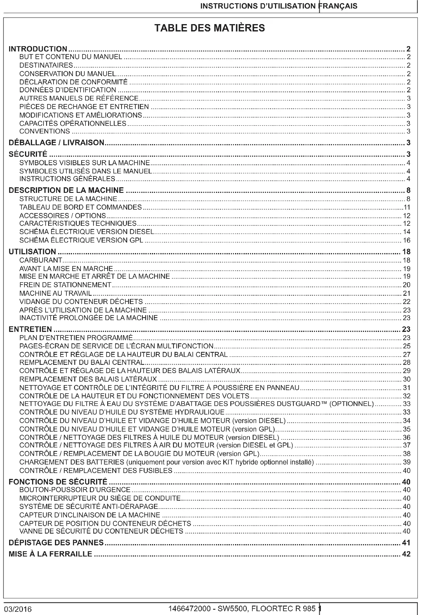 03/2016 ATTENTION ! – Cette machine est un produit de classe A : en milieu domestique, il peut provoquer un brouillage radio pour lequel il pourrait s’avérer nécessaire de prendre des mesures de prévention adaptées. – Avant d’utiliser la machine, fermer tous les couvercles et / ou portillons, comme indiqué dans les instructions d’utilisation. – Ne pas laver la machine avec des jets d’eau directs ou sous pression ou avec des substances corrosives. – Utiliser la machine exclusivement dans des endroits illuminés. – Les feux de travail (en option) ont uniquement la fonction d’améliorer la visibilité du sol à nettoyer ; ils ne permettent pas à la machine de travailler dans un endroit sombre. – Pendant l’utilisation de la machine, faire attention à sauvegarder l’intégrité des autres personnes et à éviter tout dommage matériel. – Ne pas heurter contre des étagères ou des échafaudages, en particulier en cas de danger de chute d’objets. – Ne pas poser de conteneurs de liquides sur la machine, mais utiliser le porte-boissons prévu a cet eet. – La température de stockage doit être comprise entre 0 °C et +40 °C. – La température de travail de la machine doit être comprise entre 0 °C et +40 °C. – L’humidité doit être comprise entre 30 % et 95 %. – Protéger toujours la machine du soleil, de la pluie et d’autres intempéries, pendant le fonctionnement et en état d’arrêt. Garder la machine dans un endroit couvert et sec : (si applicable) elle a été conçue pour l’utilisation à sec, par conséquent elle ne doit pas être utilisée ou gardée à l’extérieur, exposée à l’humidité. – Ne pas utiliser la machine comme moyen de transport ou de poussée / remorquage. – La portée maximum de la machine, en plus du poids de l’opérateur, est de 240 kg (poids des déchets). – En cas d’incendie, utiliser un extincteur à poudre, plutôt qu’un extincteur à eau. – Adapter la vitesse d’utilisation aux conditions d’adhérence. – Éviter tout freinage brusque en descente. Éviter tout changement brusque de direction. Procéder à vitesse réduite en descente. – La machine n’est pas approuvée pour l’utilisation sur la voie publique. – Ne pas altérer pour aucune raison les protections prévues pour la machine. – Respecter scrupuleusement les instructions prévues pour l’entretien ordinaire. – Ne pas laisser entrer d’objets dans les ouvertures. Ne pas utiliser la machine si les ouvertures sont bouchées. Garder les ouvertures de la machine libres de poussière, lasse, poils et tout autre corps étranger à même de réduire le ux d’air. – (Uniquement pour les versions avec le système d’abattage des poussières DustGuard™ installé). Faire attention pendant les déplacements de la machine en conditions de températures inférieures au point de congélation. L’eau présente dans le réservoir ou dans les tuyaux pourrait se congeler et endommager sérieusement la machine. – Ne pas enlever ou altérer les plaques installées sur la machine. – Au cas où la machine est déplacée par poussée pour des raisons de service (manque de carburant, etc.), ne jamais dépasser la vitesse de 4 km/h. – S’assurer que les éventuelles anomalies de fonctionnement de la machine ne dépendent pas du manque d’entretien. En cas contraire demander l’intervention de personnel autorisé ou d’un Service après-vente agréé. – En cas de remplacement de pièces, demander les pièces de rechange D’ORIGINE à un concessionnaire ou revendeur agréé. – An de garantir la sécurité et le bon fonctionnement de la machine, faire eectuer l’entretien programmé prévu au chapitre spécique de ce manuel par du personnel autorisé ou par un Service après-vente agréé. – Lors de la mise à la ferraille, la machine ne doit pas être abandonnée par la présence de matériaux toxiques (batteries, huiles etc.), sujets à des lois qui prévoient l’élimination auprès de centres spéciaux (voir le chapitre Mise à la ferraille). – Pendant le fonctionnement du moteur, le silencieux se chaue ; ne pas toucher le silencieux lorsqu’il est chaud pour éviter des brûlures graves et des incendies. – Le fonctionnement du moteur avec une quantité d’huile insusante peut endommager de façon grave le moteur même. Contrôler le niveau d’huile avec le moteur arrêté et la machine en position horizontale. – Ne pas faire fonctionner le moteur sans le ltre à l’air ; le moteur pourrait s’endommager. – Les interventions d’assistance technique pour le moteur doivent être eectuées par un concessionnaire agréé. Utiliser exclusivement des pièces de rechange d’origine ou des pièces équivalentes pour le moteur. L’utilisation de pièces de rechange de qualité non équivalente peut sérieusement endommager le moteur. – Voir les NORMES DE SÉCURITÉ indiquées dans le manuel du moteur, qui constitue une partie intégrante de ce manuel.INSTRUCTIONS D’UTILISATION FRANÇAIS