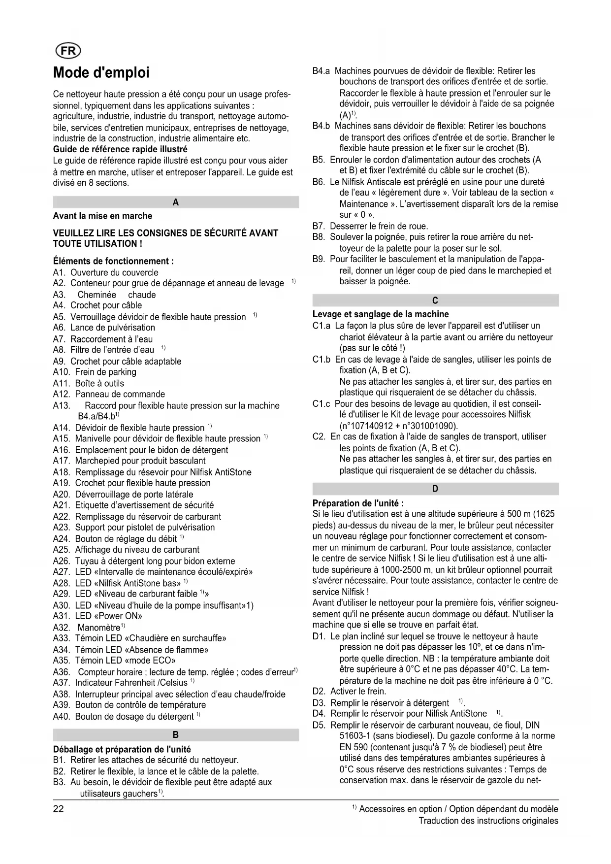 B4.b Machines sans dévidoir de flexible: Retirer les bouchons de transport des orifices d'entrée et de sortie. Brancher le flexible haute pression et le fixer sur le crochet (B). B5. Enrouler le cordon d'alimentation autour des crochets (A et B) et fixer l'extrémité du câble sur le crochet (B). B6. Le Nilfisk Antiscale est préréglé en usine pour une dureté de l’eau « légèrement dure ». Voir tableau de la section « Maintenance ». L’avertissement disparaît lors de la remise sur « 0 ». B7. Desserrer le frein de roue. B8. Soulever la poignée, puis retirer la roue arrière du net- toyeur de la palette pour la poser sur le sol. B9. Pour faciliter le basculement et la manipulation de l'appa- reil, donner un léger coup de pied dans le marchepied et baisser la poignée.
