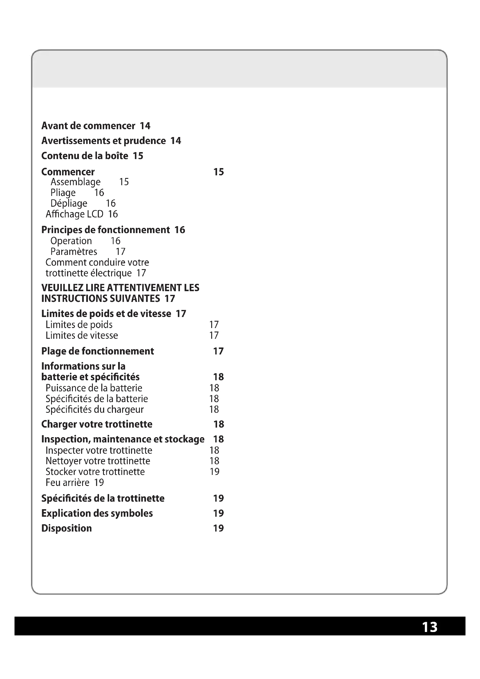 Avant de commencer 14 Avertissements et prudence 14 Contenu de la boîte 15 Commencer 15 Assemblage 15 Pliage 16 Dépliage 16 Achage LCD 16 Principes de fonctionnement 16 Operation 16 Paramètres 17 Comment conduire votre trottinette électrique 17