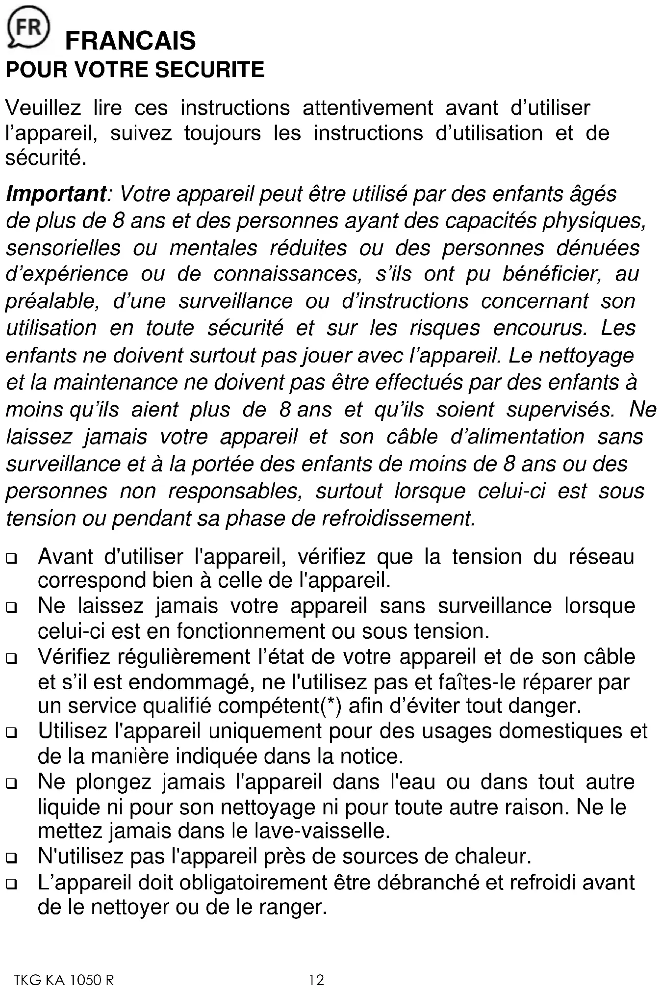 ❑ Veillez à ne pas utiliser l'appareil à l'extérieur et entreposez-le dans un endroit sec. ❑ Ne pas utiliser des accessoires non recommandés par le fabricant, cela peut présenter un danger pour l’utilisateur et risque d’endommager l’appareil. ❑ Ne déplacez jamais l’appareil en tirant sur le câble. Posez cet appareil sur un support stable et veillez à ce que le câble ne puisse pas être accroché afin d’éviter toute chute. ❑ N’utilisez pas votre appareil si la verseuse est abîmée. ❑ Utilisez uniquement la verseuse livrée avec votre appareil. Attention : votre verseuse devient chaude pendant le fonctionnement. Tenez-la uniquement par sa poignée. ❑ Veillez à ce que l’appareil n’entre pas en contact avec des matériaux facilement inflammables comme les rideaux, les tissus,... lorsqu’il est en fonctionnement. ❑ Lors du détartrage, n’utilisez que de produits spécialement étudiés. Ne faites pas usage d’ammoniac ou de toute autre substance qui pourrait nuire à votre santé. ❑ Ne mettez rien d’autre que du café moulu dans le filtre à café. ❑ Ne faites pas fonctionner votre cafetière sans eau. ❑ Ne placez jamais la verseuse dans le four à micro-ondes. ❑ Toute utilisation inappropriée est dangereuse et susceptible d’endommager l’appareil. La garantie ne sera plus d’application et le fabricant ne saurait être tenu responsable des dommages qui en résulteraient. (*) Service qualifié compétent: service après-vente du fabricant ou de l'importateur ou une personne qualifiée, reconnue et habilitée à faire ce genre de réparation afin d'éviter tout danger. Dans tous les cas, veuillez retourner l'appareil auprès de ce service.TKG KA 1050 R