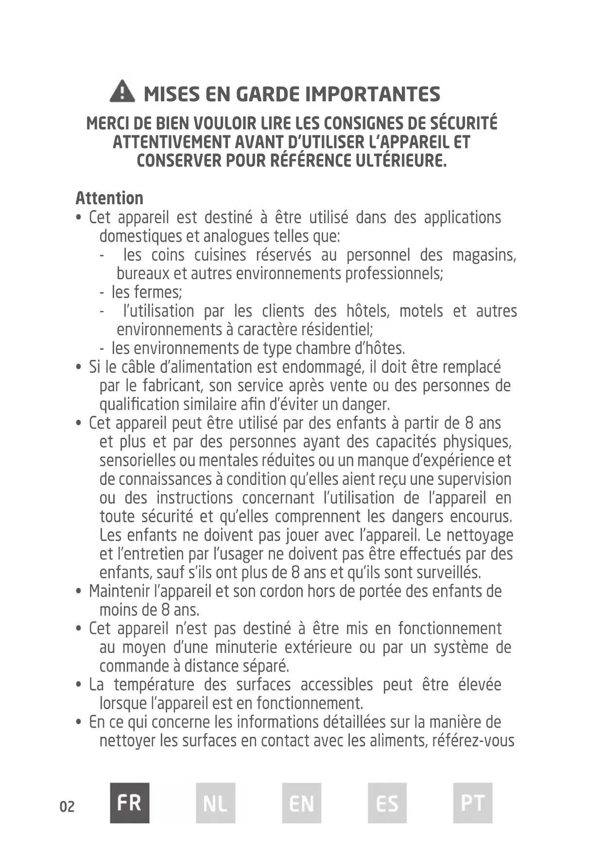 - MISE EN GARDE: Cet appareil et ses parties accessibles deviennent chauds pendant leur utilisation. Il convient de veiller à ne pas toucher les éléments chauants. Il convient de maintenir à distance les enfants de moins de 8 ans, à moins qu’ils ne soient sous une surveillance continue.