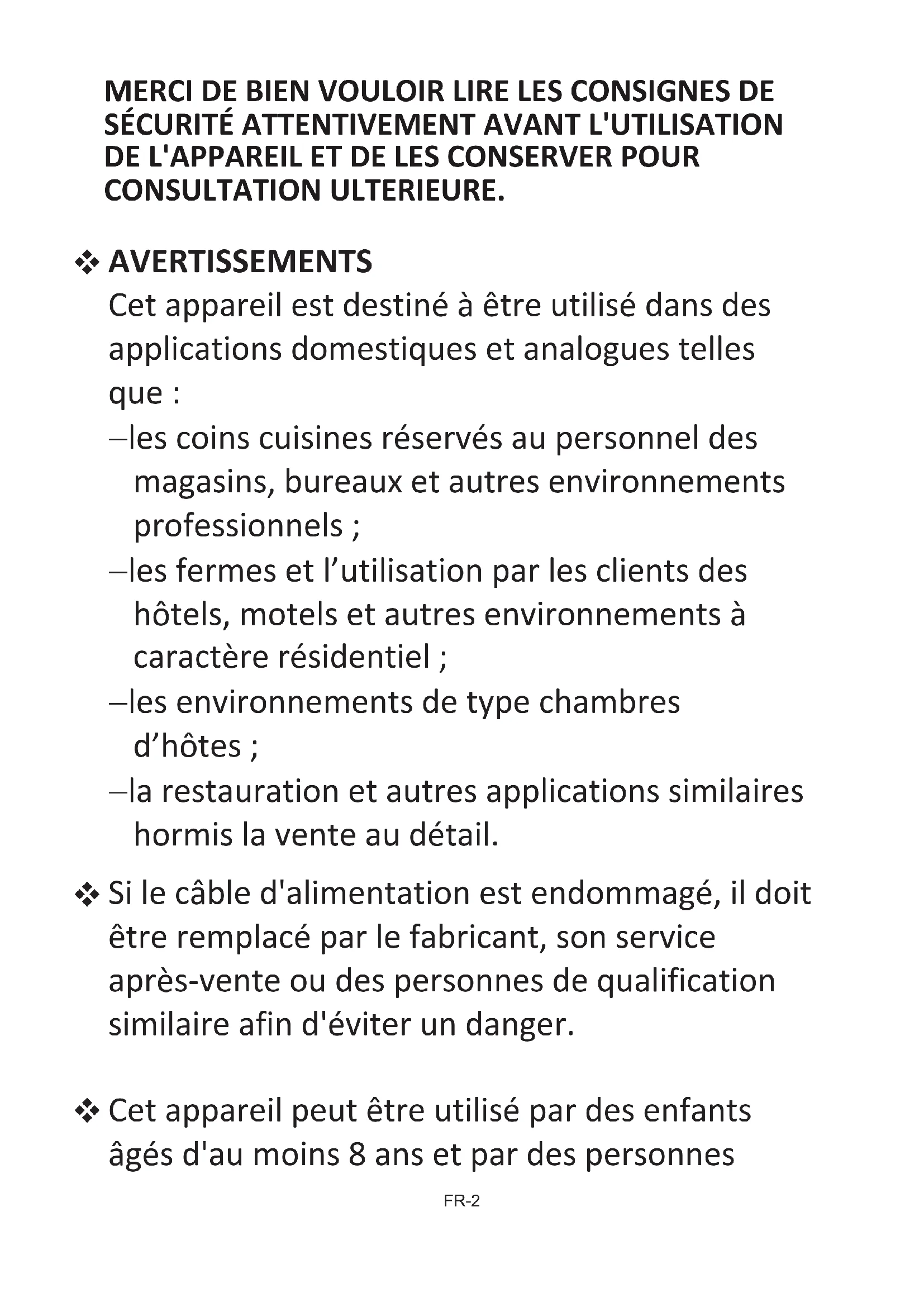 MISE AU REBUT ............................................................................................................................................ Cet appareil est destiné à être utilisé dans des applications domestiques et analogues telles que : les coins cuisines réservés au personnel des magasins, bureaux et autres environnements professionnels ; les fermes et l’utilisation par les clients des hôtels, motels et autres environnements à caractère résidentiel ; les environnements de type chambres d’hôtes ; la restauration et autres applications similaires hormis la vente au détail. Si le câble d'alimentation est endommagé, il doit être remplacé par le fabricant, son service après-vente ou des personnes de qualification similaire afin d'éviter un danger. Cet appareil peut être utilisé par des enfants âgés d'au moins 8 ans et par des personnes