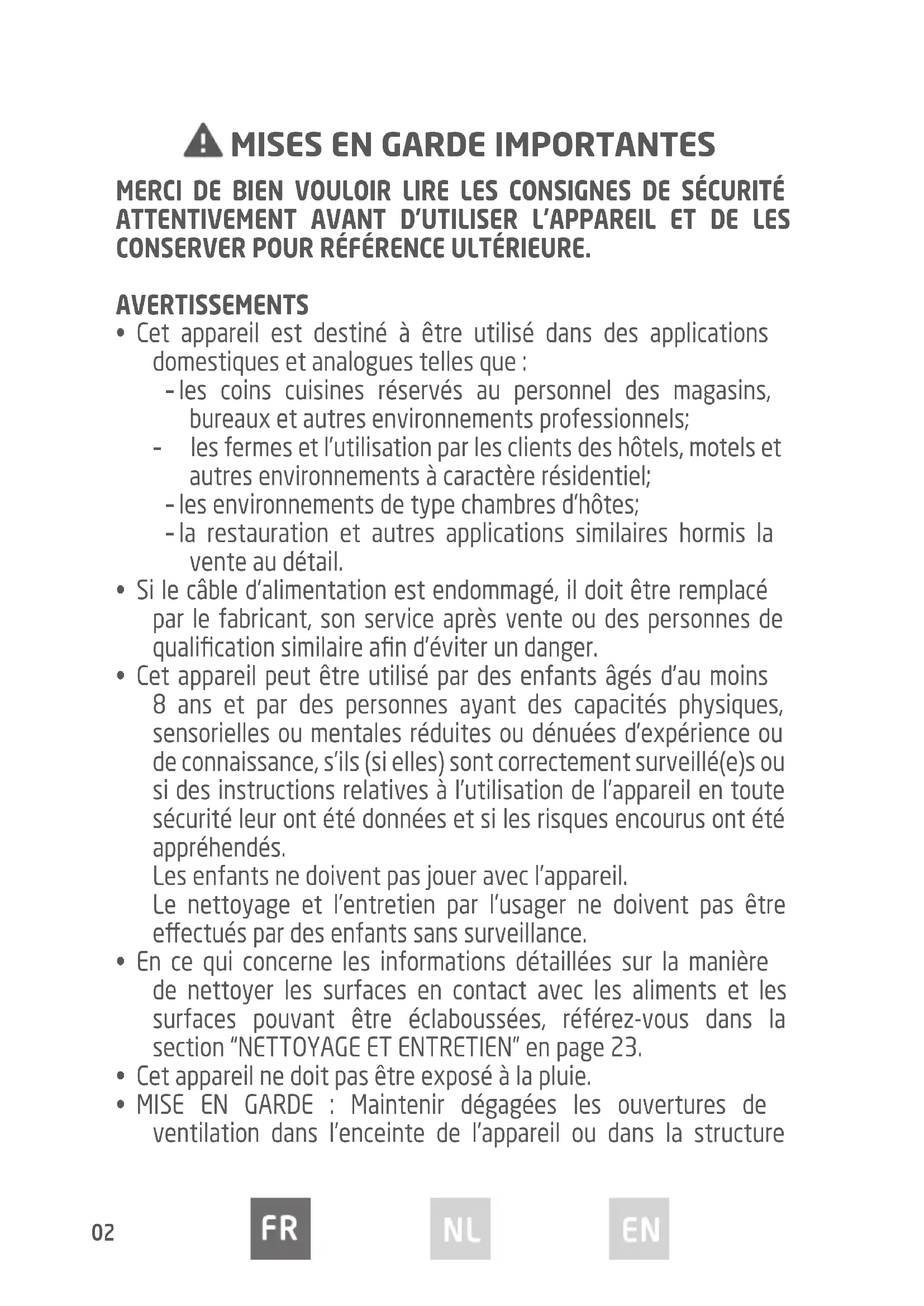 - En ce qui concerne les informations détaillées sur la manière de nettoyer les surfaces en contact avec les aliments et les surfaces pouvant être éclaboussées, référez-vous dans la section “NETTOYAGE ET ENTRETIEN” en page 23.