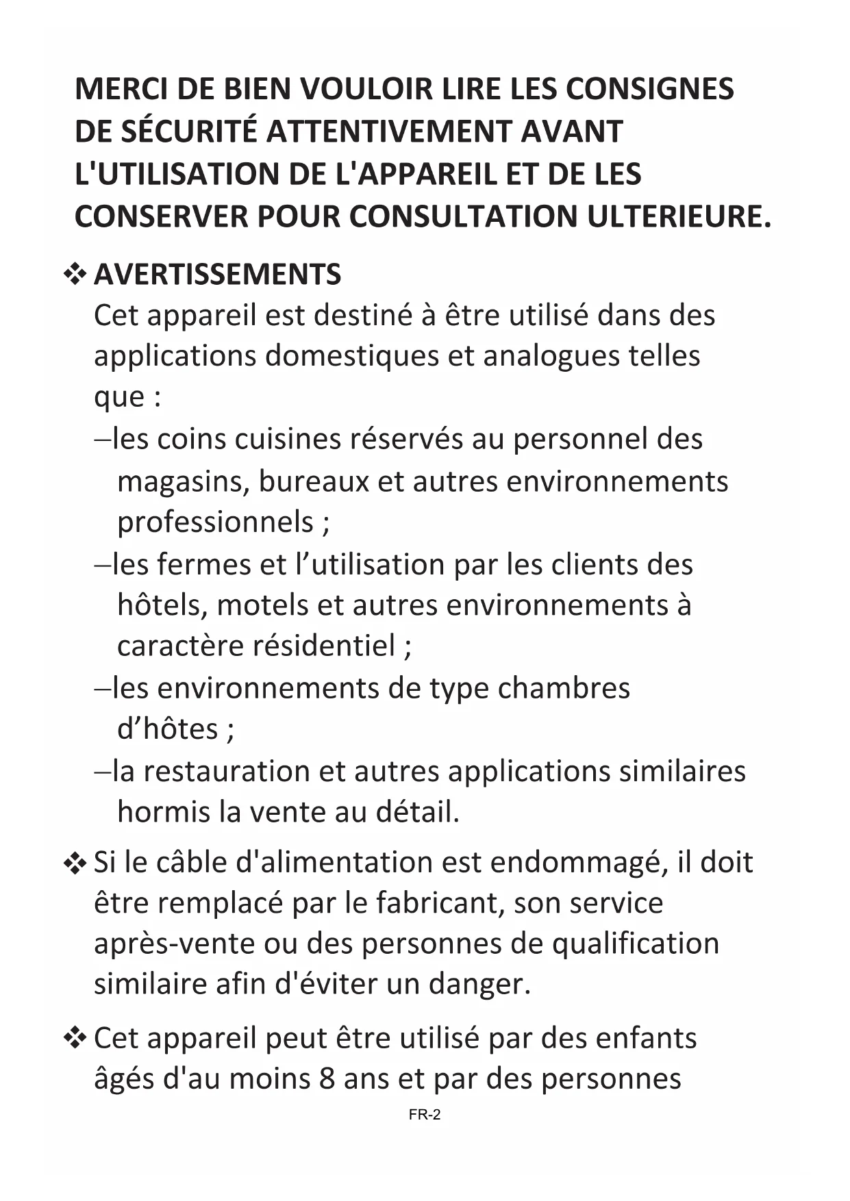 SERVICE DE RÉPARATION ET PIÈCES DE RECHANGE..................................................26 MISE AU REBUT ..........................................................................................................27AVERTISSEMENTS Cet appareil est destiné à être utilisé dans des applications domestiques et analogues telles que : les coins cuisines réservés au personnel des magasins, bureaux et autres environnements professionnels ; les fermes et l’utilisation par les clients des hôtels, motels et autres environnements à caractère résidentiel ; les environnements de type chambres d’hôtes ; la restauration et autres applications similaires hormis la vente au détail. Si le câble d'alimentation est endommagé, il doit être remplacé par le fabricant, son service après-vente ou des personnes de qualification similaire afin d'éviter un danger. Cet appareil peut être utilisé par des enfants âgés d'au moins 8 ans et par des personnes