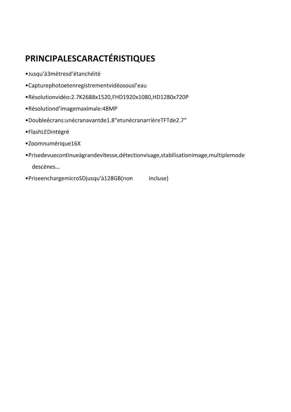 s pouvez enfin copier puis coller les photos que vous désirez dans le dossier de votre choix sur votre ordinateur. CARACTÉRISTIQUES TECHNIQUES : Capteur d’images CMOS SONY Résolution d’image (48M) 8000x6000, (30M) 6400x4800, (24M) 5600x4200, (20M) 5200x3900, (16M) 4608x3456, (12M) 4000x3000, (8M) 3264x2448, (7MHD) 3648x2048, (5M) 2592x1944, (3M) 2048x1536, (2MHD) 1920x1080 Résolution vidéo 2.7K 2688X1520, FHD1920x1080, HD1280x720P Écrans