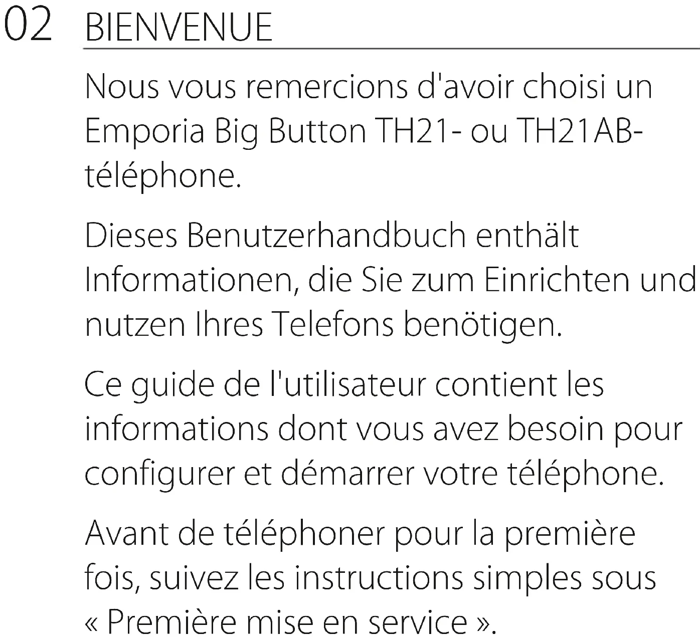 Nous vous remercions d'avoir choisi un Emporia Big Button TH21- ou TH21AB- téléphone. Dieses Benutzerhandbuch enthält Informationen, die Sie zum Einrichten und nutzen Ihres Telefons benötigen. Ce guide de l'utilisateur contient les informations dont vous avez besoin pour configurer et démarrer votre téléphone. Avant de téléphoner pour la première fois, suivez les instructions simples sous « Première mise en service ». BIENVENUE03 Aperçu de votre téléphone ......................... 04
