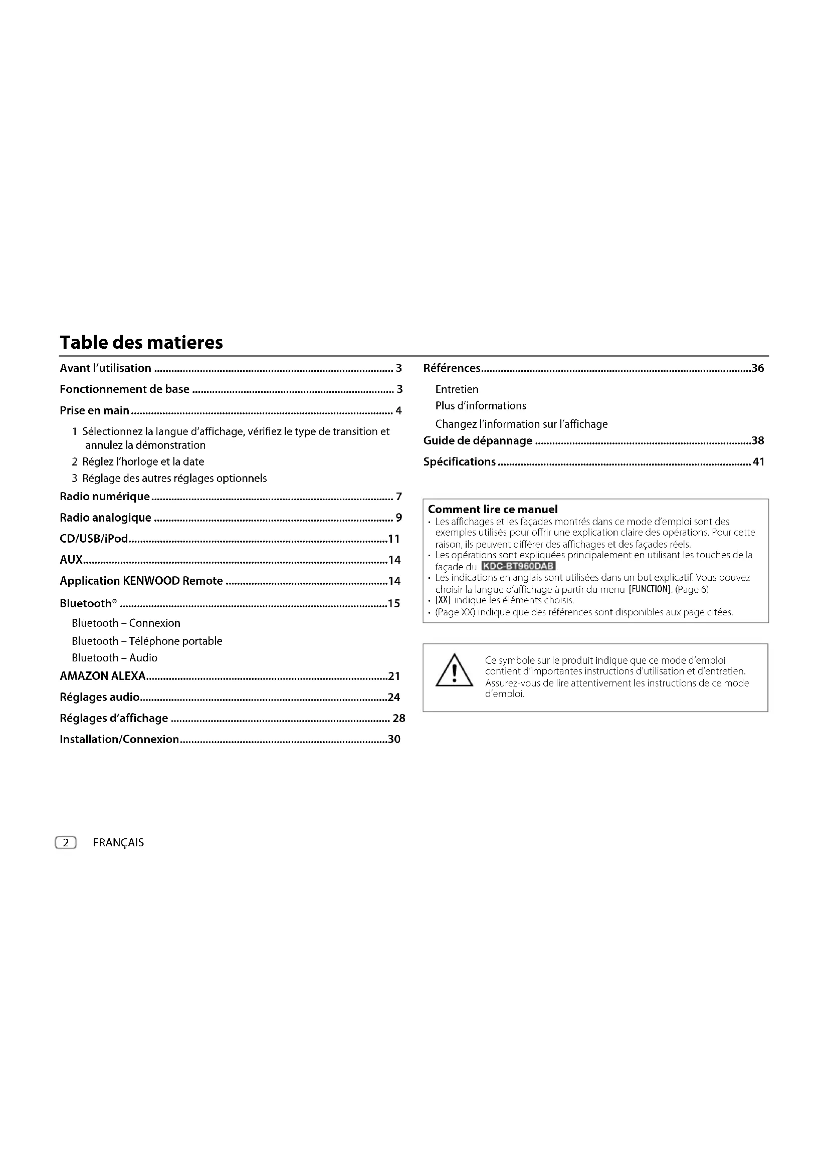 - (PageXX) indique que des références sont disponibles aux page citées. Ce symbole sur le produit indique que ce mode d’emploi contient d’importantes instructions d’utilisation et d’entretien. Assurez-vous de lire attentivement les instructions de ce mode d’emploi. KDC-BT960DAB_E_FR.indd 2KDC-BT960DAB_E_FR.indd 2 29/3/2022 4:21:21 PM29/3/2022 4:21:21 PMFRANÇAIS