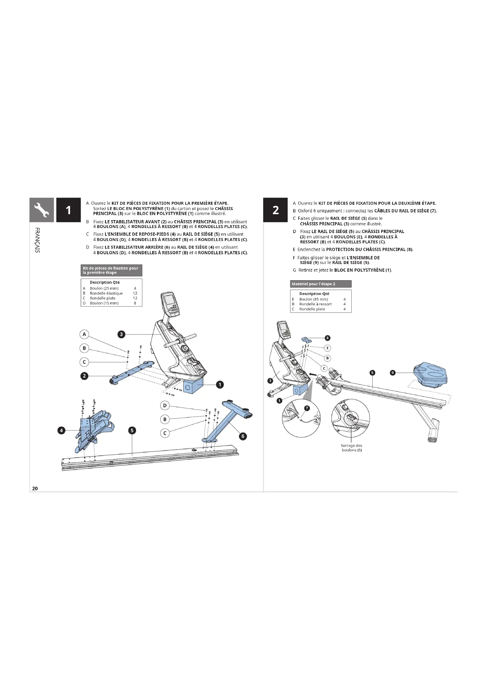 OXFORD 6 ILLUSTRÉ20 A Ouvrez le KIT DE PIÈCES DE FIXATION POUR LA PREMIÈRE ÉTAPE. Sortez LE BLOC EN POLYSTYRÈNE (1) du carton et posez le CHÂSSIS PRINCIPAL (3) sur le BLOC EN POLYSTYRÈNE (1) comme illustré. B Fixez LE STABILISATEUR AVANT (2) au CHÂSSIS PRINCIPAL (3) en utilisant 4 BOULONS (A), 4 RONDELLES À RESSORT (B) et 4 RONDELLES PLATES (C). C Fixez L’ENSEMBLE DE REPOSE-PIEDS (4) au RAIL DE SIÈGE (5) en utilisant 4 BOULONS (D), 4 RONDELLES À RESSORT (B) et 4 RONDELLES PLATES (C). D Fixez LE STABILISATEUR ARRIÈRE (6) au RAIL DE SIÈGE (4) en utilisant 4 BOULONS (D), 4 RONDELLES À RESSORT (B) et 4 RONDELLES PLATES (C).