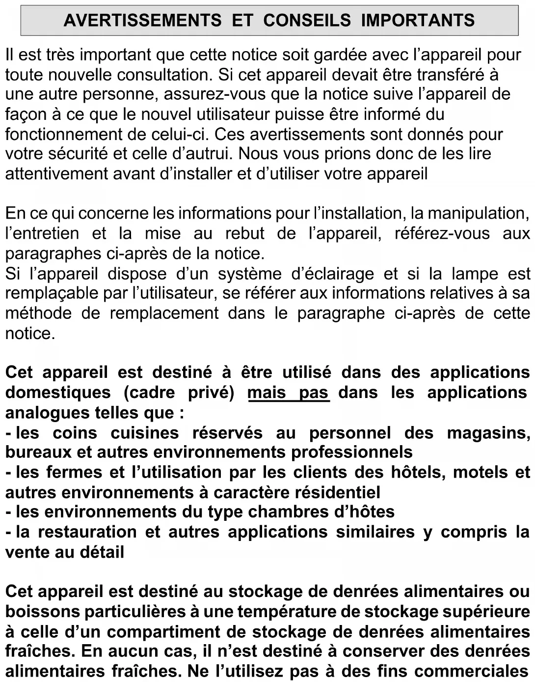 Il est très important que cette notice soit gardée avec l’appareil pour toute nouvelle consultation. Si cet appareil devait être transféré à une autre personne, assurez-vous que la notice suive l’appareil de façon à ce que le nouvel utilisateur puisse être informé du fonctionnement de celui-ci. Ces avertissements sont donnés pour votre sécurité et celle d’autrui. Nous vous prions donc de les lire attentivement avant d’installer et d’utiliser votre appareil En ce qui concerne les informations pour l’installation, la manipulation, l’entretien et la mise au rebut de l’appareil, référez-vous aux paragraphes ci-après de la notice. Si l’appareil dispose d’un système d’éclairage et si la lampe est remplaçable par l’utilisateur, se référer aux informations relatives à sa méthode de remplacement dans le paragraphe ci-après de cette notice. Cet appareil est destiné à être utilisé dans des applications domestiques (cadre privé) mais pas dans les applications analogues telles que : - l es coins cuisines réservés au personnel des magasins, bureaux et autres environnements professionnels - les fermes et l’utilisation par les clients des hôtels, motels et autres environnements à caractère résidentiel - les environnements du type chambres d’hôtes - la restauration et autres applications similaires y compris la vente au détail Cet appareil est destiné au stockage de denrées alimentaires ou boissons particulières à une température de stockage supérieure à celle d’un compartiment de stockage de denrées alimentaires fraîches. En aucun cas, il n’est destiné à conserver des denrées alimentaires fraîches. Ne l’utilisez pas à des fins commerciales