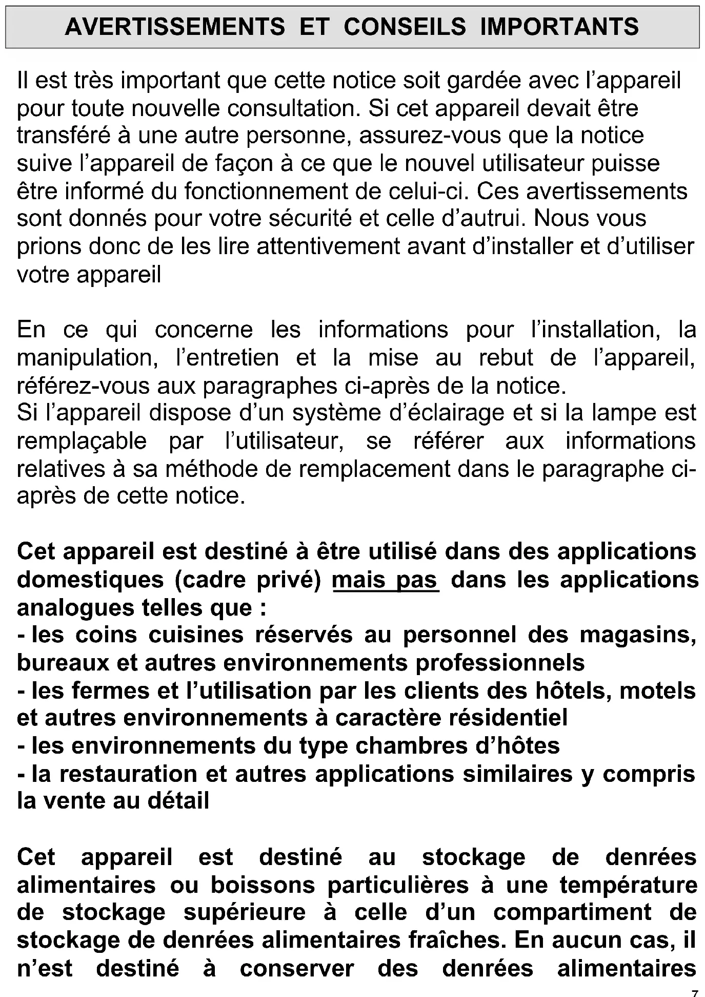 Il est très important que cette notice soit gardée avec l’appareil pour toute nouvelle consultation. Si cet appareil devait être transféré à une autre personne, assurez-vous que la notice suive l’appareil de façon à ce que le nouvel utilisateur puisse être informé du fonctionnement de celui-ci. Ces avertissements sont donnés pour votre sécurité et celle d’autrui. Nous vous prions donc de les lire attentivement avant d’installer et d’utiliser votre appareil En ce qui concerne les informations pour l’installation, la manipulation, l’entretien et la mise au rebut de l’appareil, référez-vous aux paragraphes ci-après de la notice. Si l’appareil dispose d’un système d’éclairage et si la lampe est remplaçable par l’utilisateur, se référer aux informations relatives à sa méthode de remplacement dans le paragraphe ci- après de cette notice. Cet appareil est destiné à être utilisé dans des applications domestiques (cadre privé) mais pas dans les applications analogues telles que : - les coins cuisines réservés au personnel des magasins, bureaux et autres environnements professionnels - les fermes et l’utilisation par les clients des hôtels, motels et autres environnements à caractère résidentiel - les environnements du type chambres d’hôtes - la restauration et autres applications similaires y compris la vente au détail Cet appareil est destiné au stockage de denrées alimentaires ou boissons particulières à une température de stockage supérieure à celle d’un compartiment de stockage de denrées alimentaires fraîches. En aucun cas, il n’est destiné à conserver des denrées alimentaires8 fraîches. Ne l’utilisez pas à des fins commerciales ou industrielles ou pour d’autre but que celui pour lequel il a été conçu. Sécurité
