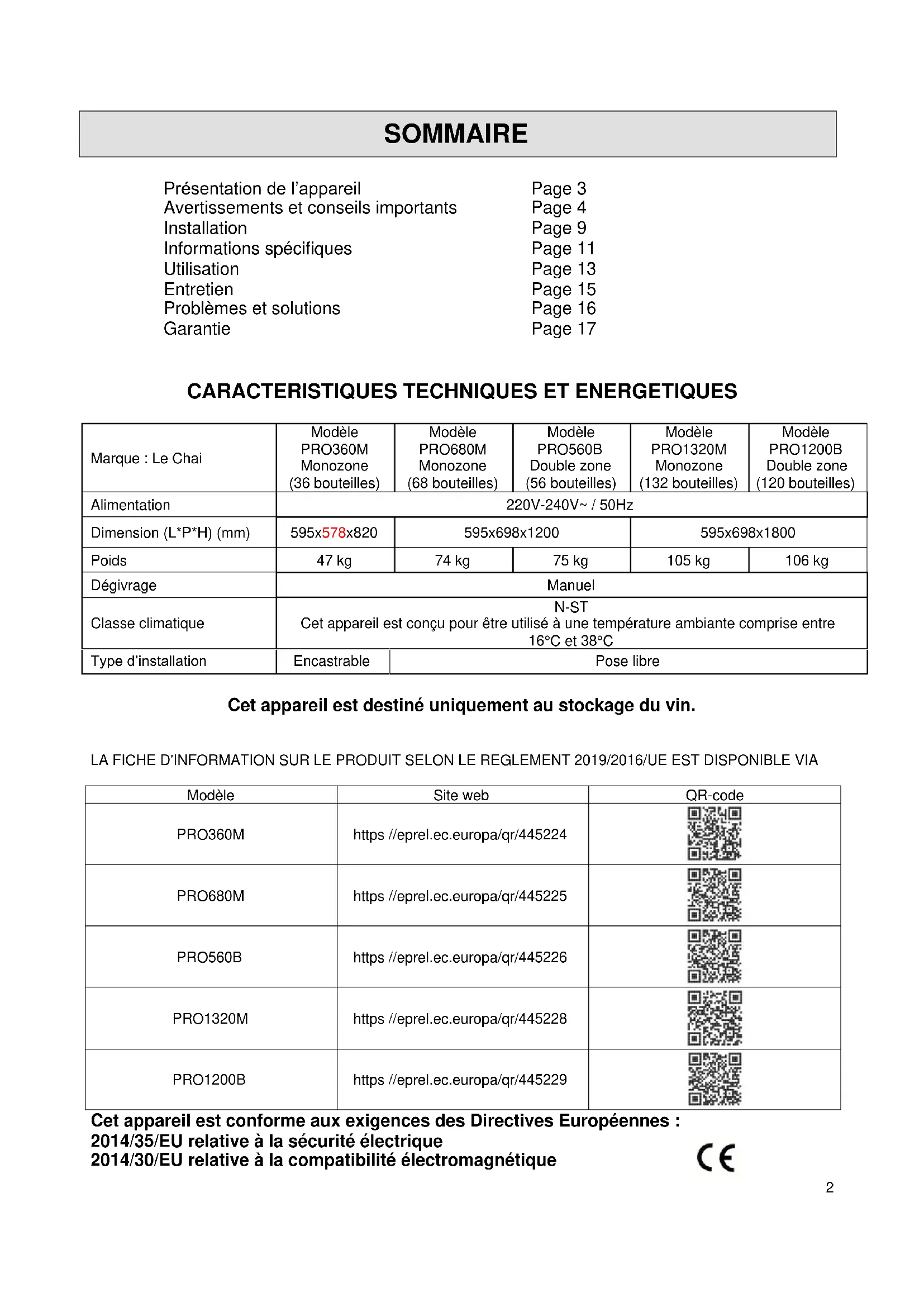 PRO360M : 36 bouteilles PRO680M : 68 bouteilles PRO560B : 56 bouteilles PRO1320M : 132 bouteilles PRO1200B : 120 bouteilles2 SOMMAIRE