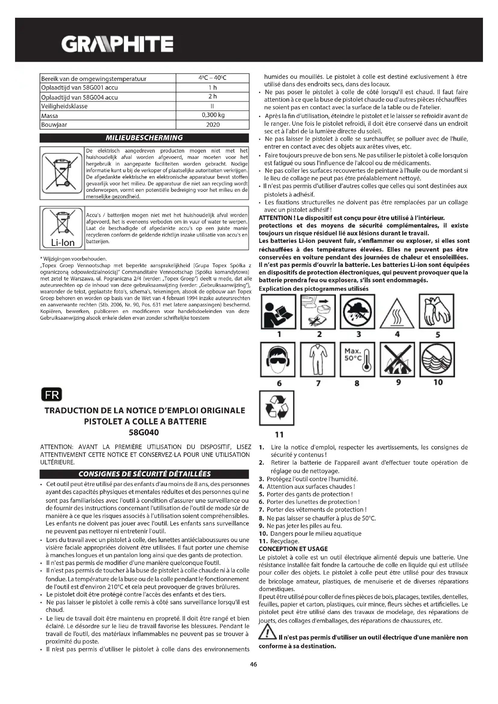 Paramètre Valeur Tension de batterie 18 V CC Diamètre de la cartouche de colle 11 mm Température de l’élément chauant 160°C ÷ 210°C Durée d’échauement min 3 min Rendement 8 g/ min Classe de protection III. Masse 0,4 kg Année de fabrication 2020 Batterie Graphite Energy+ Paramètre Valeur48 Batterie 58G001 58G004 Tension de la batterie 18 V DC 18 V DC Type de batterie Li-Ion Li-Ion Capacité de la batterie 2000 mAh 4000 mAh Plage de température ambiante 4